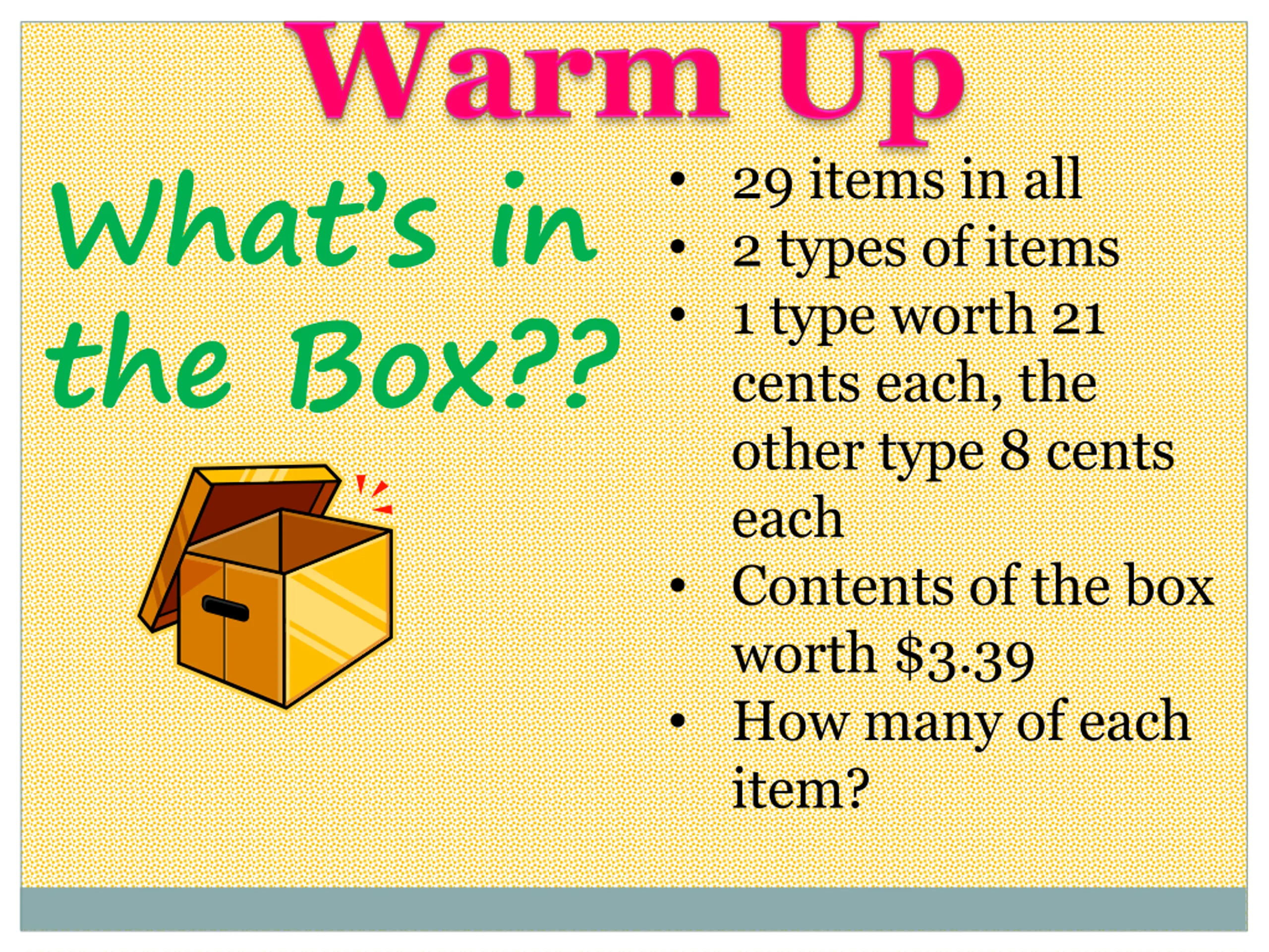 Whats in the Box?? 29 items in all 2 types of items 1 type worth 21 cents each, the other type 8 cents each Contents of the box worth $3.39 How many of each item?