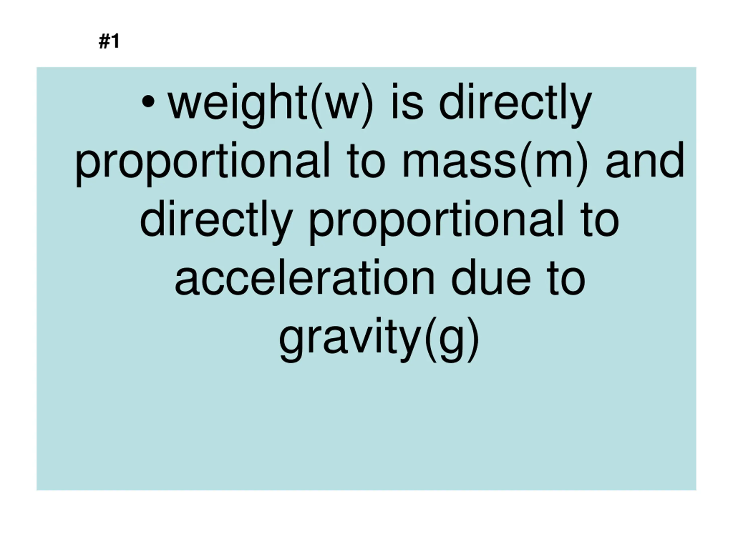 #1 weight(w) is directly proportional to mass(m) and directly proportional to acceleration due to gravity(g)
