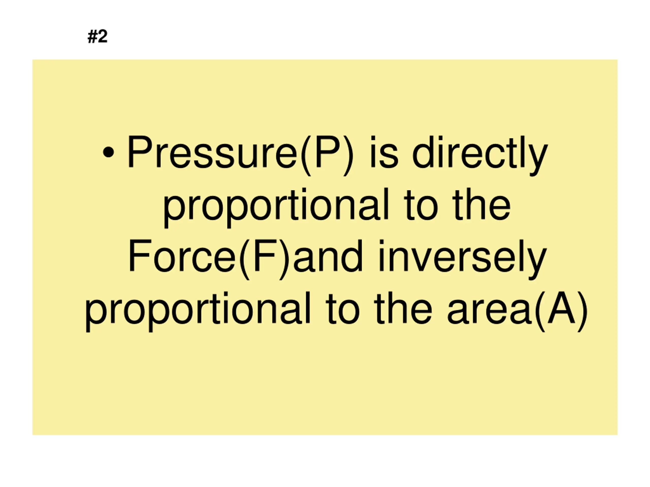 #2 Pressure(P) is directly proportional to the Force(F)and inversely proportional to the area(A)