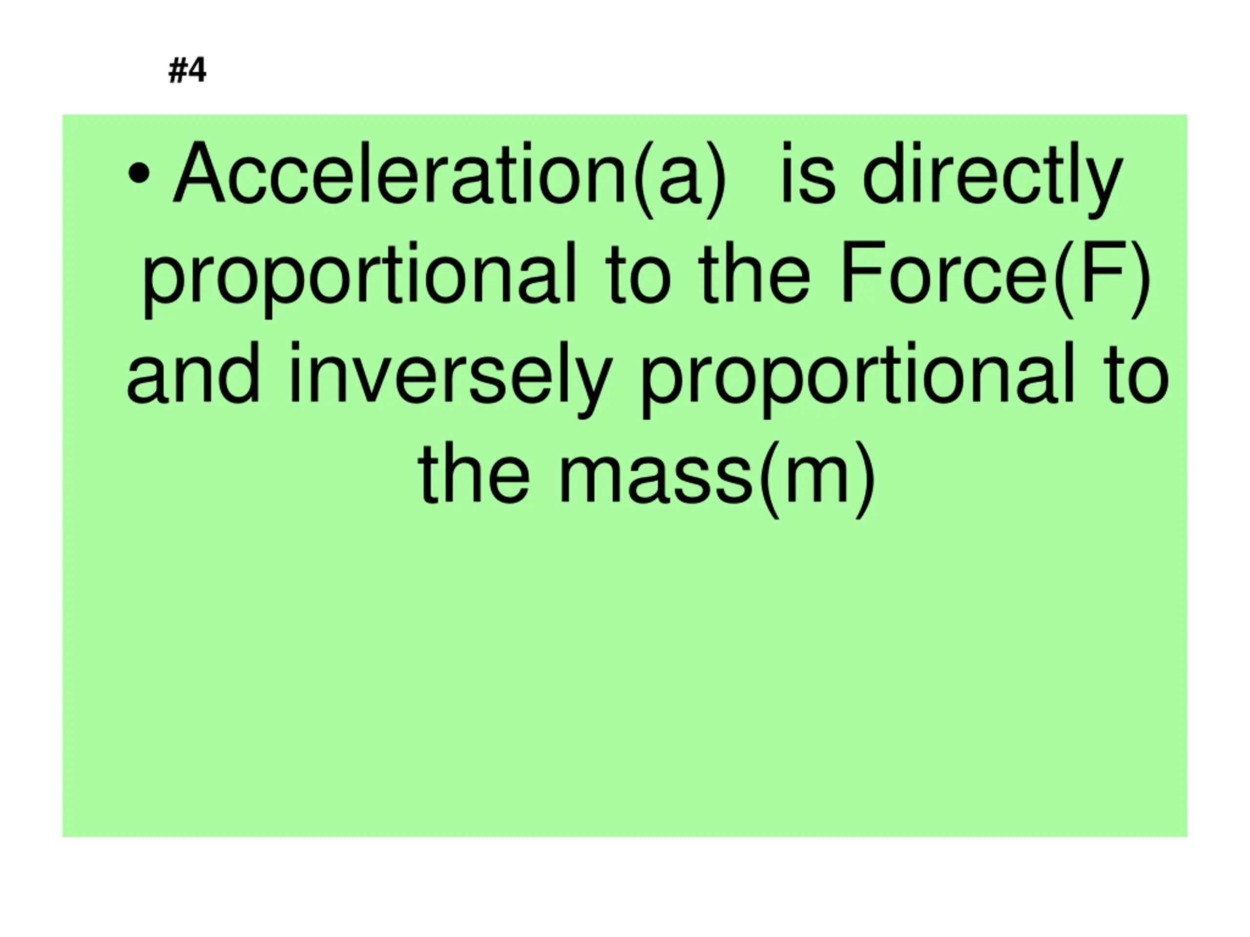#4 Acceleration(a) is directly proportional to the Force(F) and inversely proportional to the mass(m)