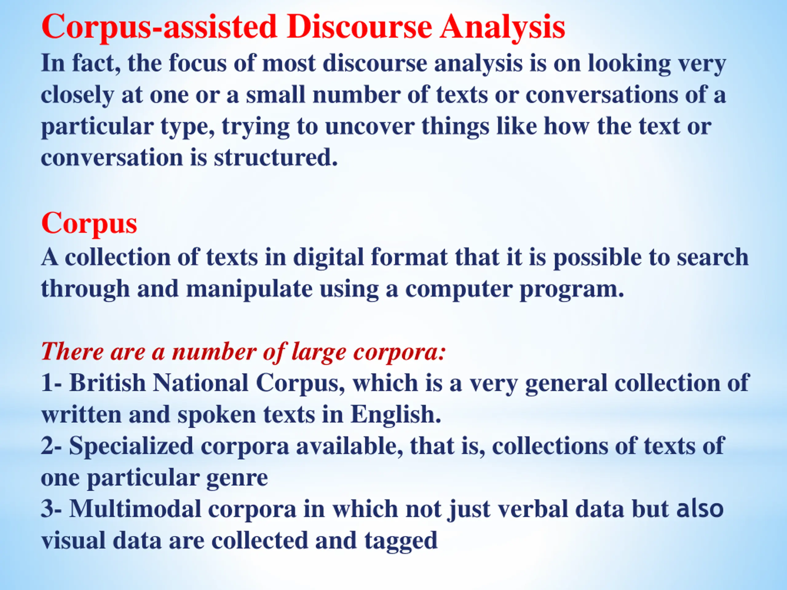 Corpus-assisted Discourse Analysis In fact, the focus of most discourse analysis is on looking very closely at one or a small number of texts or conversations of a particular type, trying to uncover things like how the text or conversation is structured. Corpus A collection of texts in digital format that it is possible to search through and manipulate using a computer program. There are a number of large corpora: 1- British National Corpus, which is a very general collection of written and spoken texts in English. 2- Specialized corpora available, that is, collections of texts of one particular genre 3- Multimodal corpora in which not just verbal data but also visual data are collected and tagged