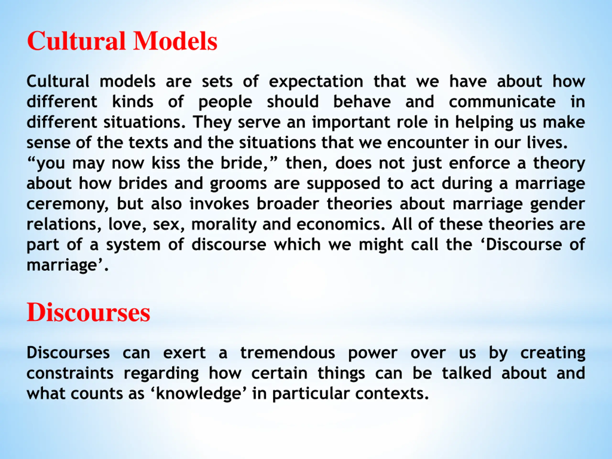 Cultural Models Cultural models are sets of expectation that we have about how different kinds of people should behave and communicate in different situations. They serve an important role in helping us make sense of the texts and the situations that we encounter in our lives. you may now kiss the bride, then, does not just enforce a theory about how brides and grooms are supposed to act during a marriage ceremony, but also invokes broader theories about marriage gender relations, love, sex, morality and economics. All of these theories are part of a system of discourse which we might call the Discourse of marriage . Discourses Discourses can exert a tremendous power over us by creating constraints regarding how certain things can be talked about and what counts as knowledge in particular contexts.