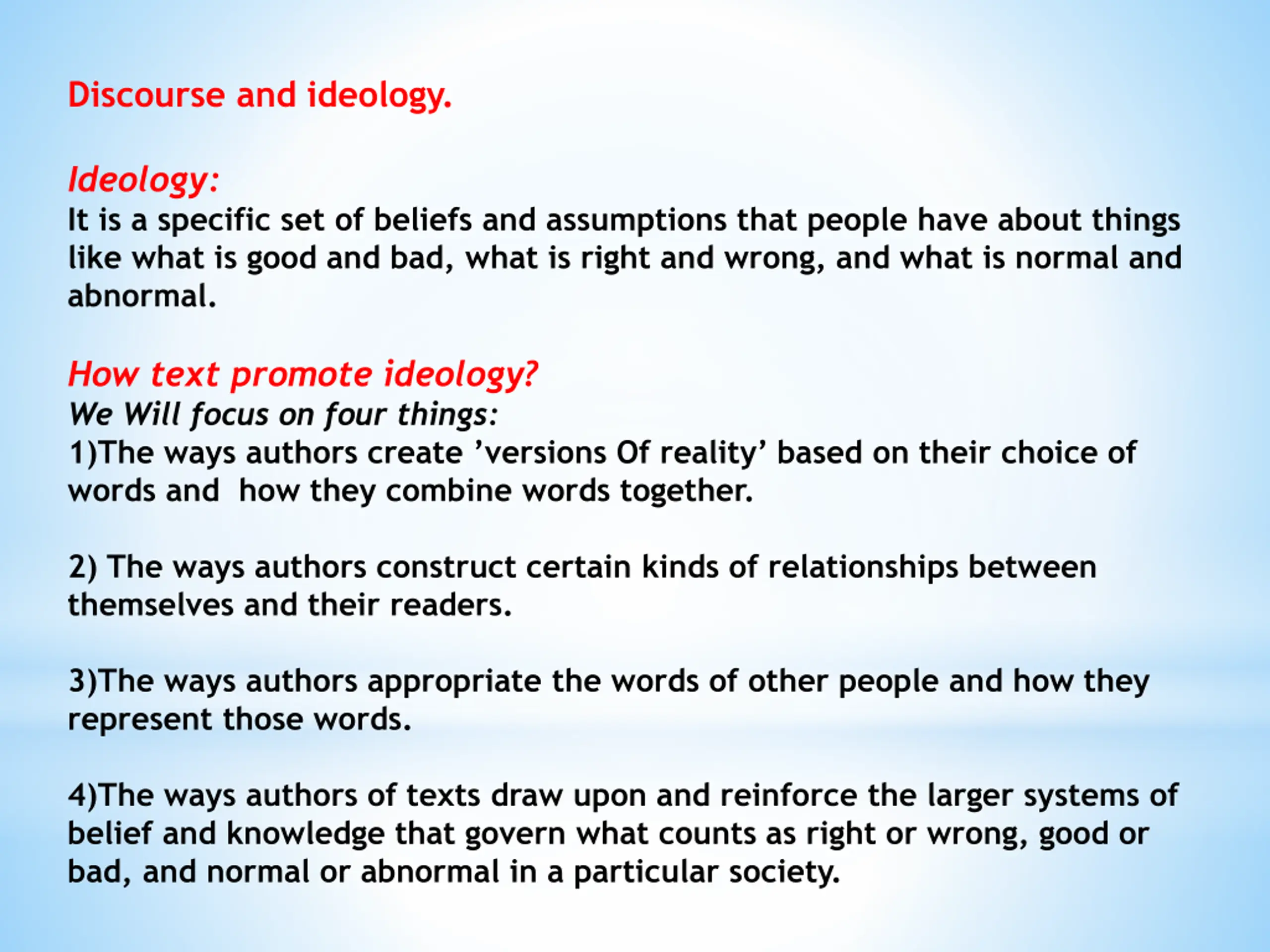 Discourse and ideology. Ideology: It is a specific set of beliefs and assumptions that people have about things like what is good and bad, what is right and wrong, and what is normal and abnormal. How text promote ideology? We Will focus on four things: 1)The ways authors create versions Of reality based on their choice of words and how they combine words together. 2) The ways authors construct certain kinds of relationships between themselves and their readers. 3)The ways authors appropriate the words of other people and how they represent those words. 4)The ways authors of texts draw upon and reinforce the larger systems of belief and knowledge that govern what counts as right or wrong, good or bad, and normal or abnormal in a particular society.
