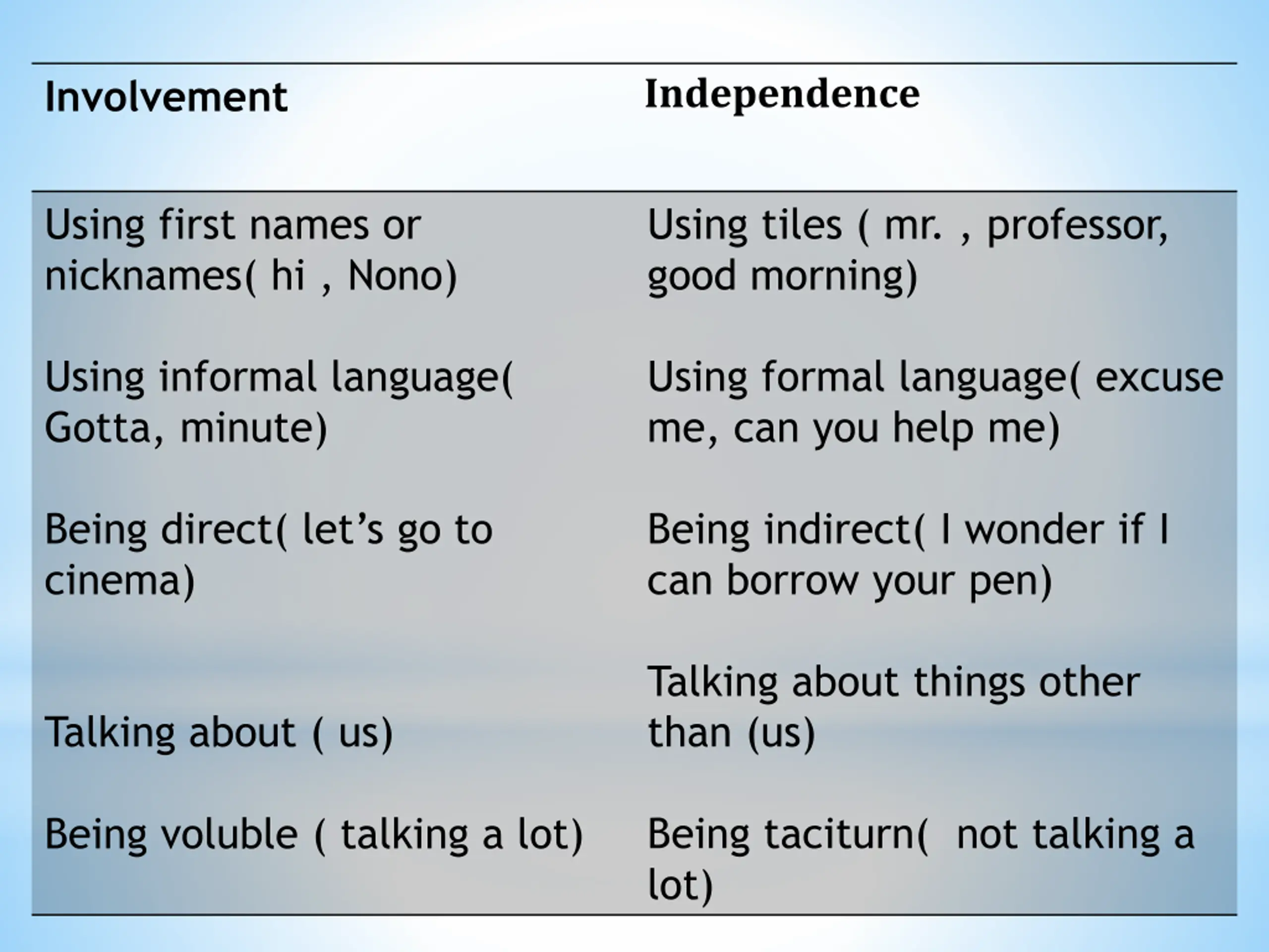Independence Involvement Using first names or nicknames( hi , Nono) Using tiles ( mr. , professor, good morning) Using informal language( Gotta, minute) Using formal language( excuse me, can you help me) Being direct( let s go to cinema) Being indirect( I wonder if I can borrow your pen) Talking about things other than (us) Talking about ( us) Being taciturn( not talking a lot) Being voluble ( talking a lot)