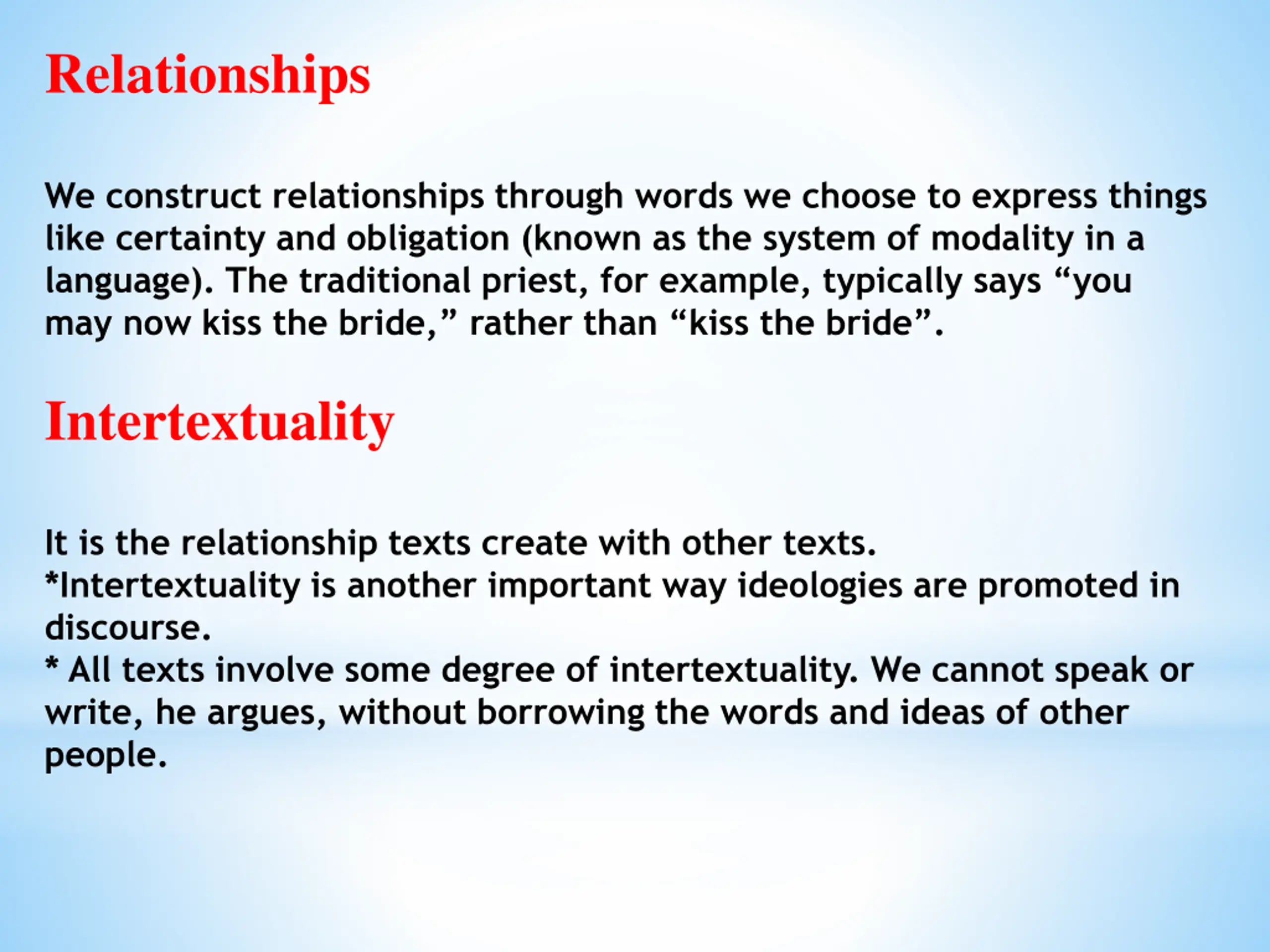Relationships We construct relationships through words we choose to express things like certainty and obligation (known as the system of modality in a language). The traditional priest, for example, typically says you may now kiss the bride, rather than kiss the bride . Intertextuality It is the relationship texts create with other texts. *Intertextuality is another important way ideologies are promoted in discourse. * All texts involve some degree of intertextuality. We cannot speak or write, he argues, without borrowing the words and ideas of other people.