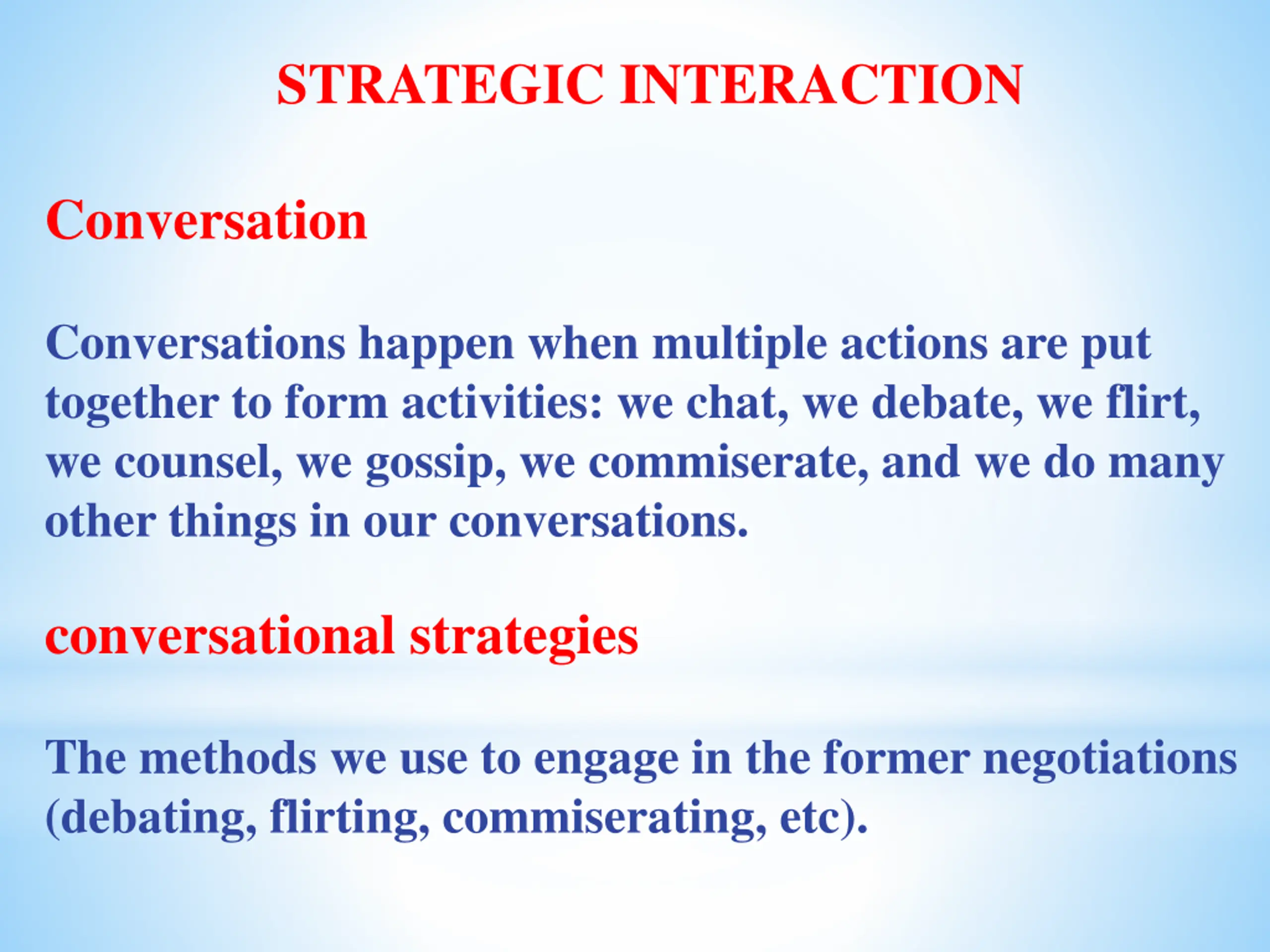 STRATEGIC INTERACTION Conversation Conversations happen when multiple actions are put together to form activities: we chat, we debate, we flirt, we counsel, we gossip, we commiserate, and we do many other things in our conversations. conversational strategies The methods we use to engage in the former negotiations (debating, flirting, commiserating, etc).