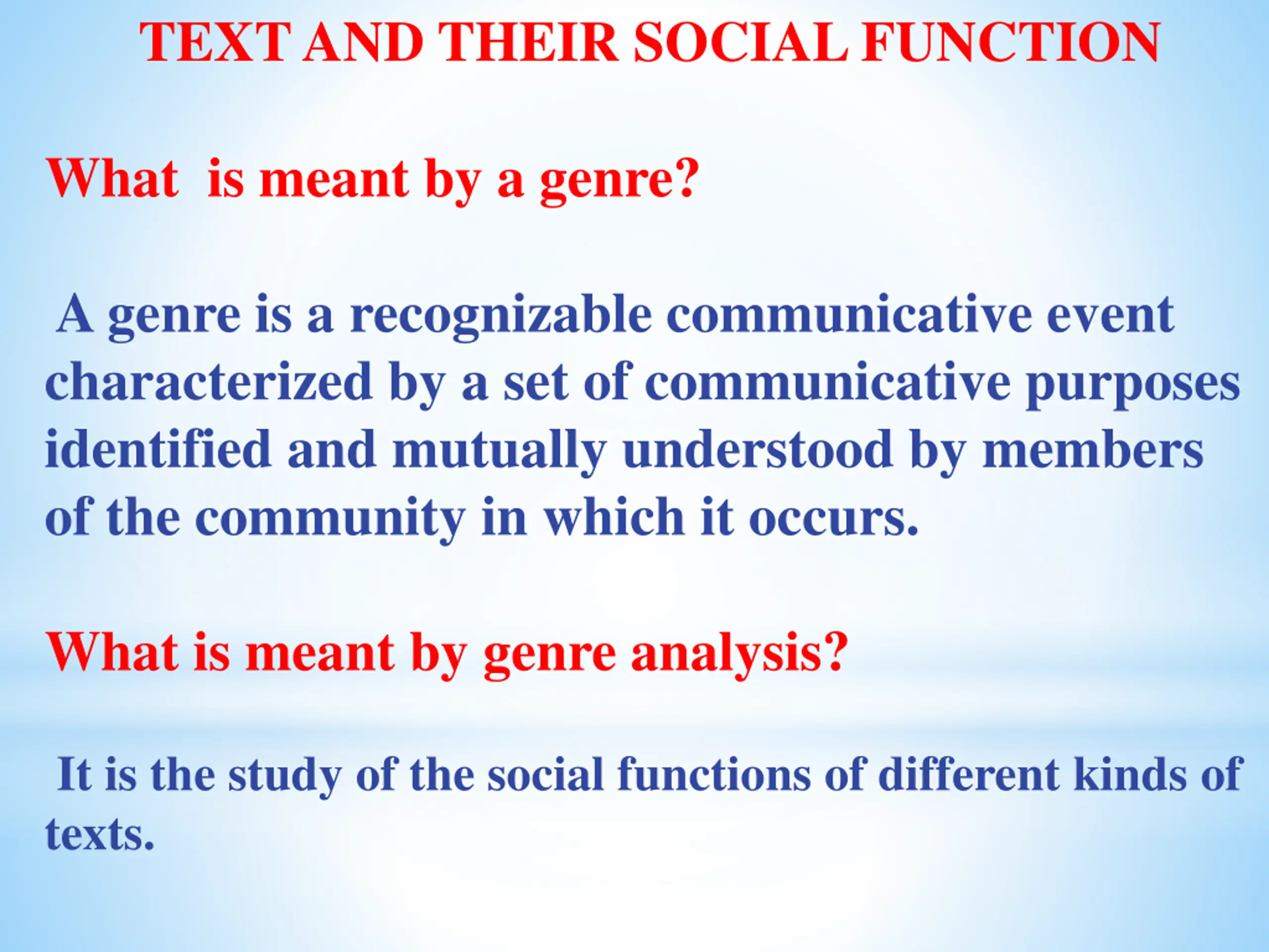 TEXT AND THEIR SOCIAL FUNCTION What is meant by a genre? A genre is a recognizable communicative event characterized by a set of communicative purposes identified and mutually understood by members of the community in which it occurs. What is meant by genre analysis? It is the study of the social functions of different kinds of texts.