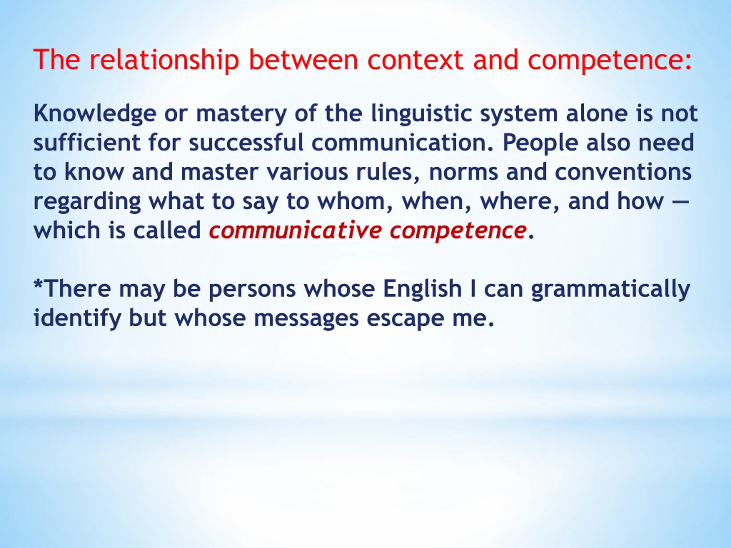The relationship between context and competence: Knowledge or mastery of the linguistic system alone is not sufficient for successful communication. People also need to know and master various rules, norms and conventions regarding what to say to whom, when, where, and how which is called communicative competence. *There may be persons whose English I can grammatically identify but whose messages escape me.