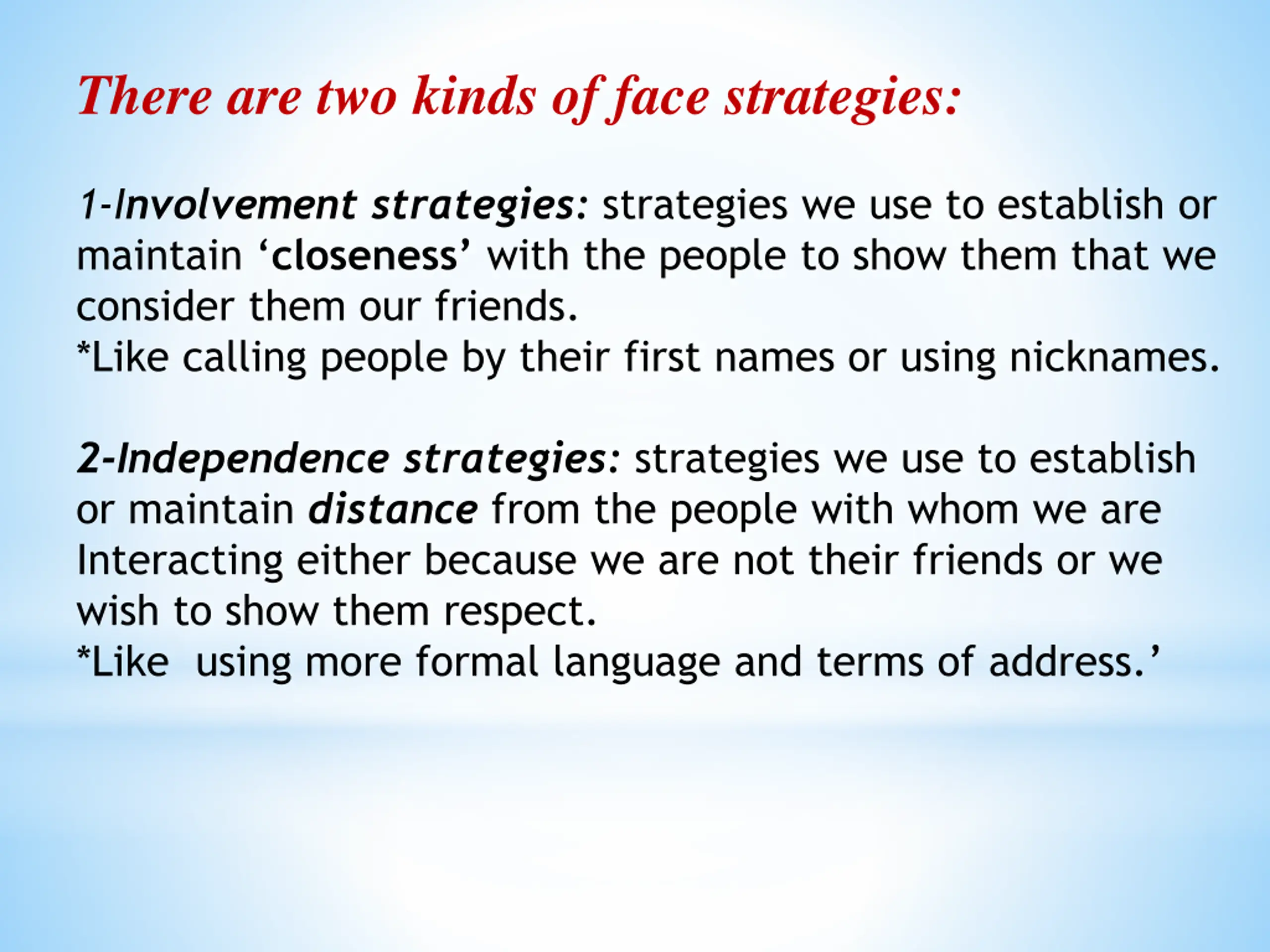 There are two kinds of face strategies: 1-Involvement strategies: strategies we use to establish or maintain closeness with the people to show them that we consider them our friends. *Like calling people by their first names or using nicknames. 2-Independence strategies: strategies we use to establish or maintain distance from the people with whom we are Interacting either because we are not their friends or we wish to show them respect. *Like using more formal language and terms of address.