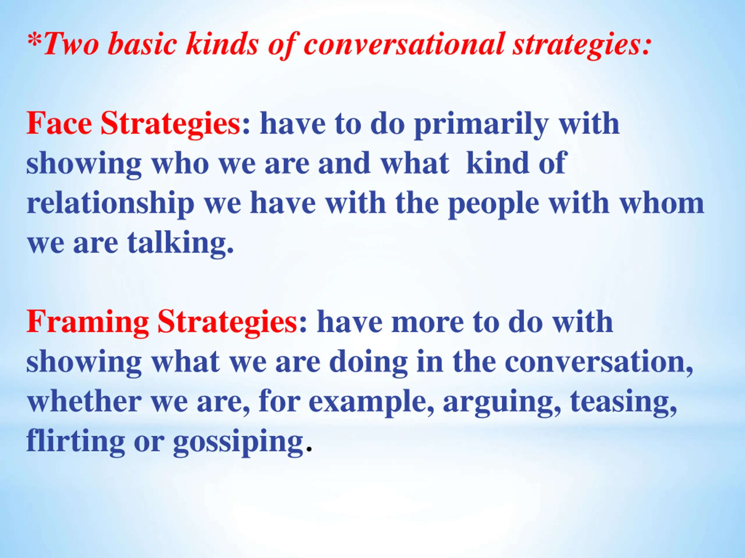 *Two basic kinds of conversational strategies: Face Strategies: have to do primarily with showing who we are and what kind of relationship we have with the people with whom we are talking. Framing Strategies: have more to do with showing what we are doing in the conversation, whether we are, for example, arguing, teasing, flirting or gossiping.
