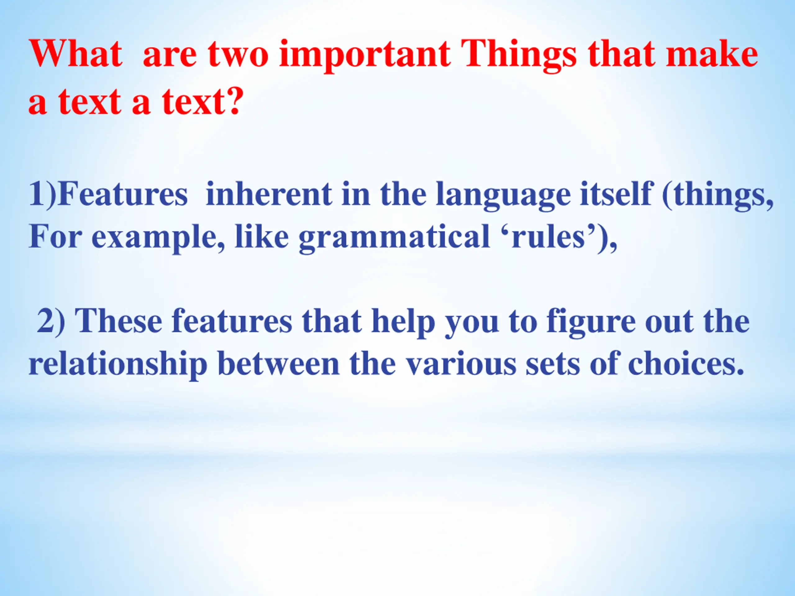 What are two important Things that make a text a text? 1)Features inherent in the language itself (things, For example, like grammatical rules ), 2) These features that help you to figure out the relationship between the various sets of choices.