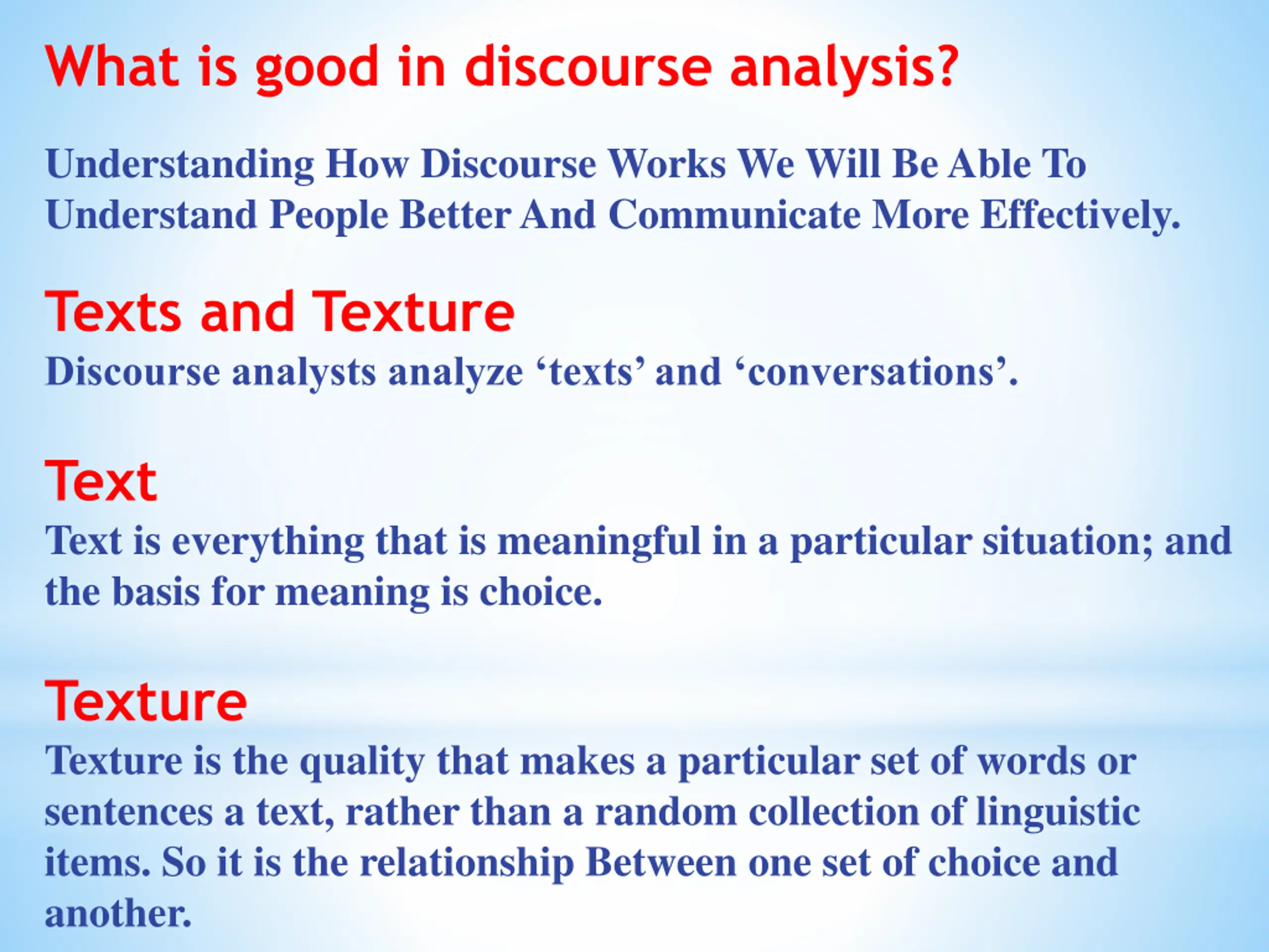 What is good in discourse analysis? Understanding How Discourse Works We Will Be Able To Understand People Better And Communicate More Effectively. Texts and Texture Discourse analysts analyze texts and conversations . Text Text is everything that is meaningful in a particular situation; and the basis for meaning is choice. Texture Texture is the quality that makes a particular set of words or sentences a text, rather than a random collection of linguistic items. So it is the relationship Between one set of choice and another.