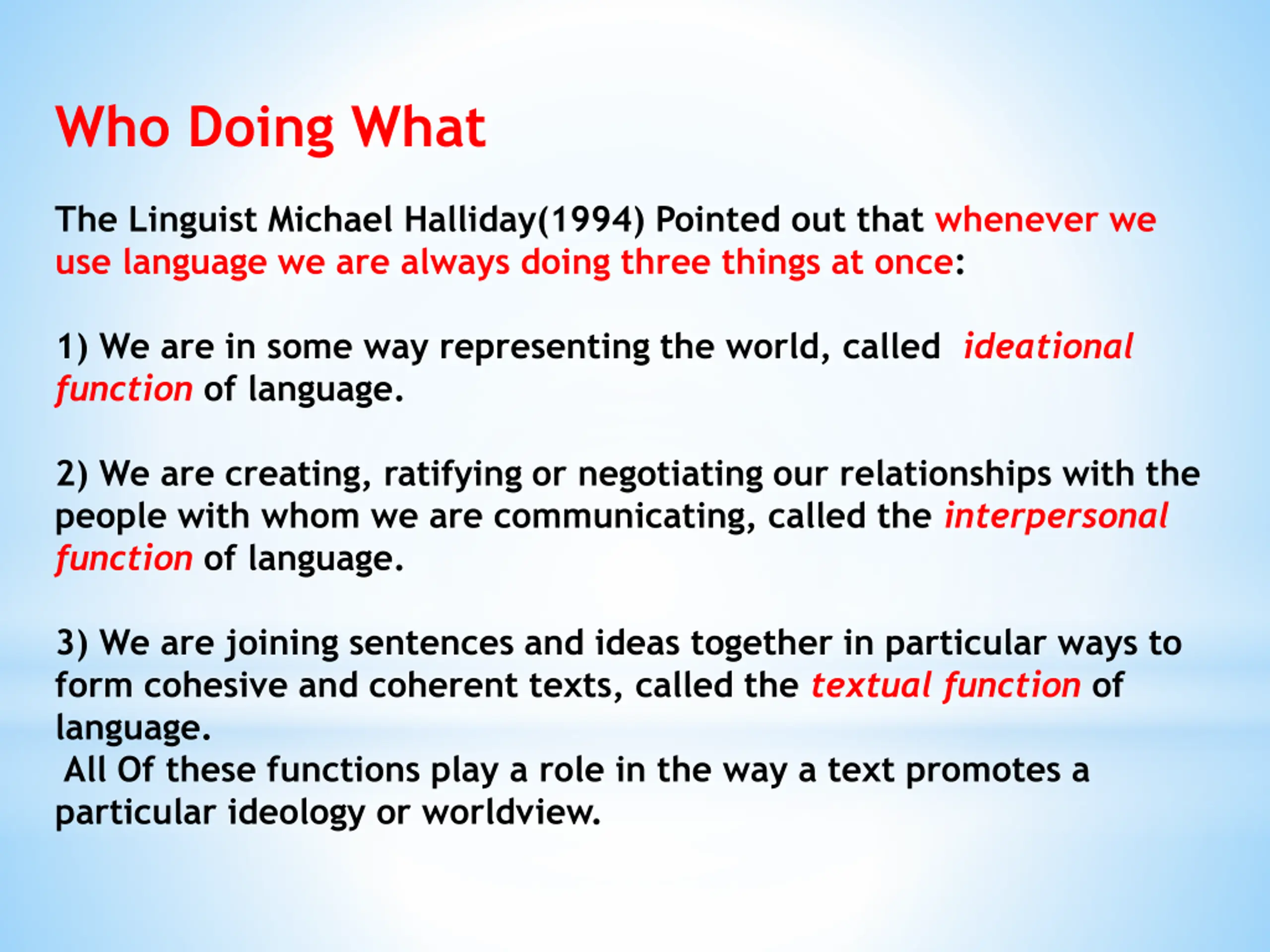 Who Doing What The Linguist Michael Halliday(1994) Pointed out that whenever we use language we are always doing three things at once: 1) We are in some way representing the world, called ideational function of language. 2) We are creating, ratifying or negotiating our relationships with the people with whom we are communicating, called the interpersonal function of language. 3) We are joining sentences and ideas together in particular ways to form cohesive and coherent texts, called the textual function of language. All Of these functions play a role in the way a text promotes a particular ideology or worldview.