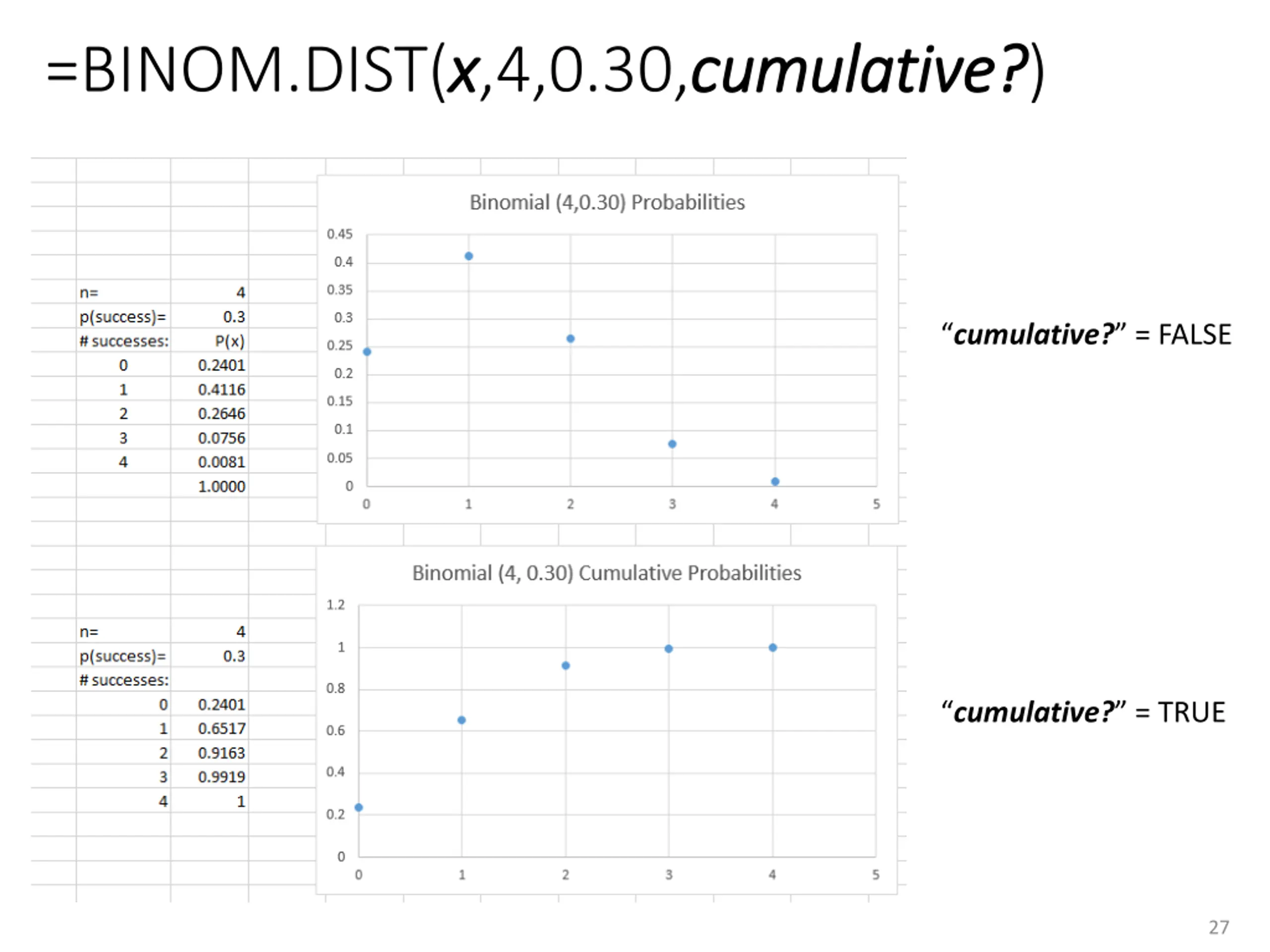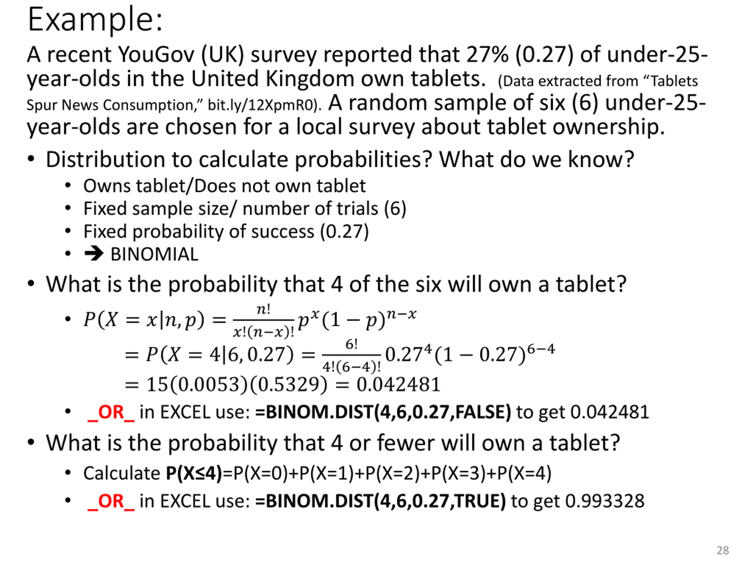 =BINOM.DIST(x x,4,0.30,cumulative cumulative? ?) cumulative? = FALSE cumulative? = TRUE 27