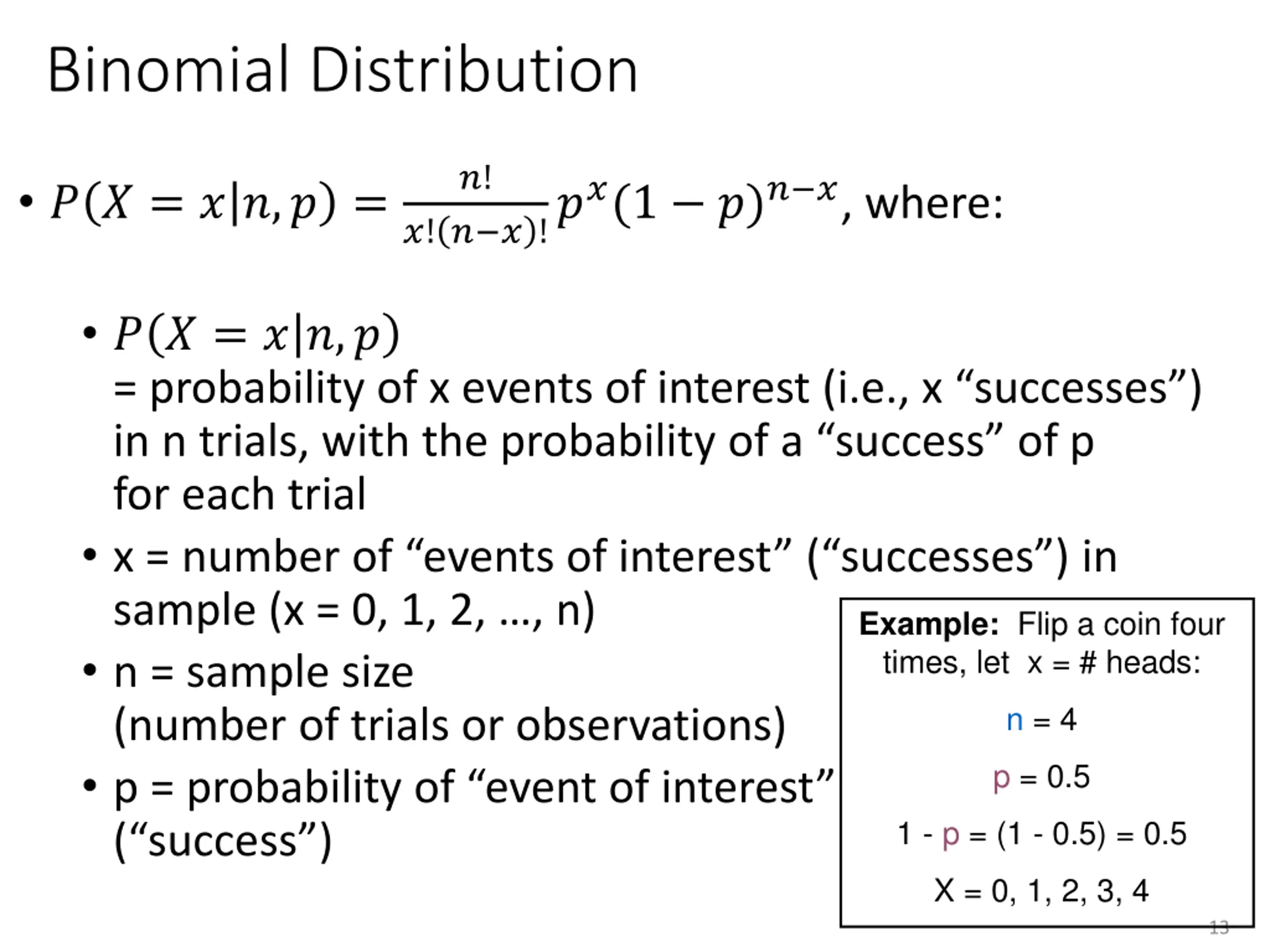 Binomial Distribution ?! ?! ? ? !??(1 ?)? ?, where: ? ? = ? ?,? = ? ? = ? ?,? = probability of x events of interest (i.e., x successes ) in n trials, with the probability of a success of p for each trial x = number of events of interest ( successes ) in sample (x = 0, 1, 2, , n) n = sample size (number of trials or observations) p = probability of event of interest ( success ) Example: Flip a coin four times, let x = # heads: n = 4 p = 0.5 1 - p = (1 - 0.5) = 0.5 X = 0, 1, 2, 3, 4 13