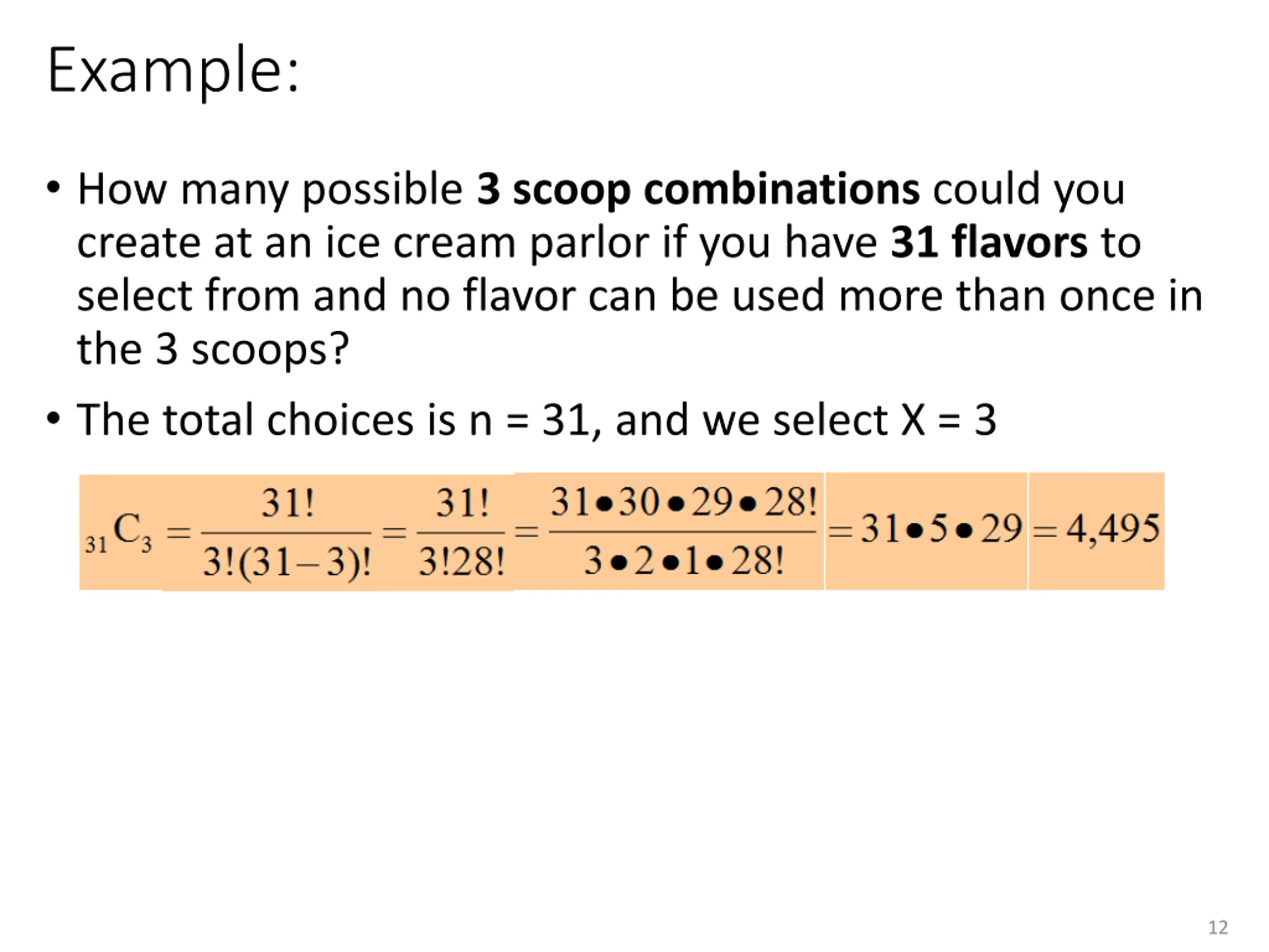 Example: How many possible 3 scoop combinations could you create at an ice cream parlor if you have 31 flavors to select from and no flavor can be used more than once in the 3 scoops? The total choices is n = 31, and we select X = 3 12