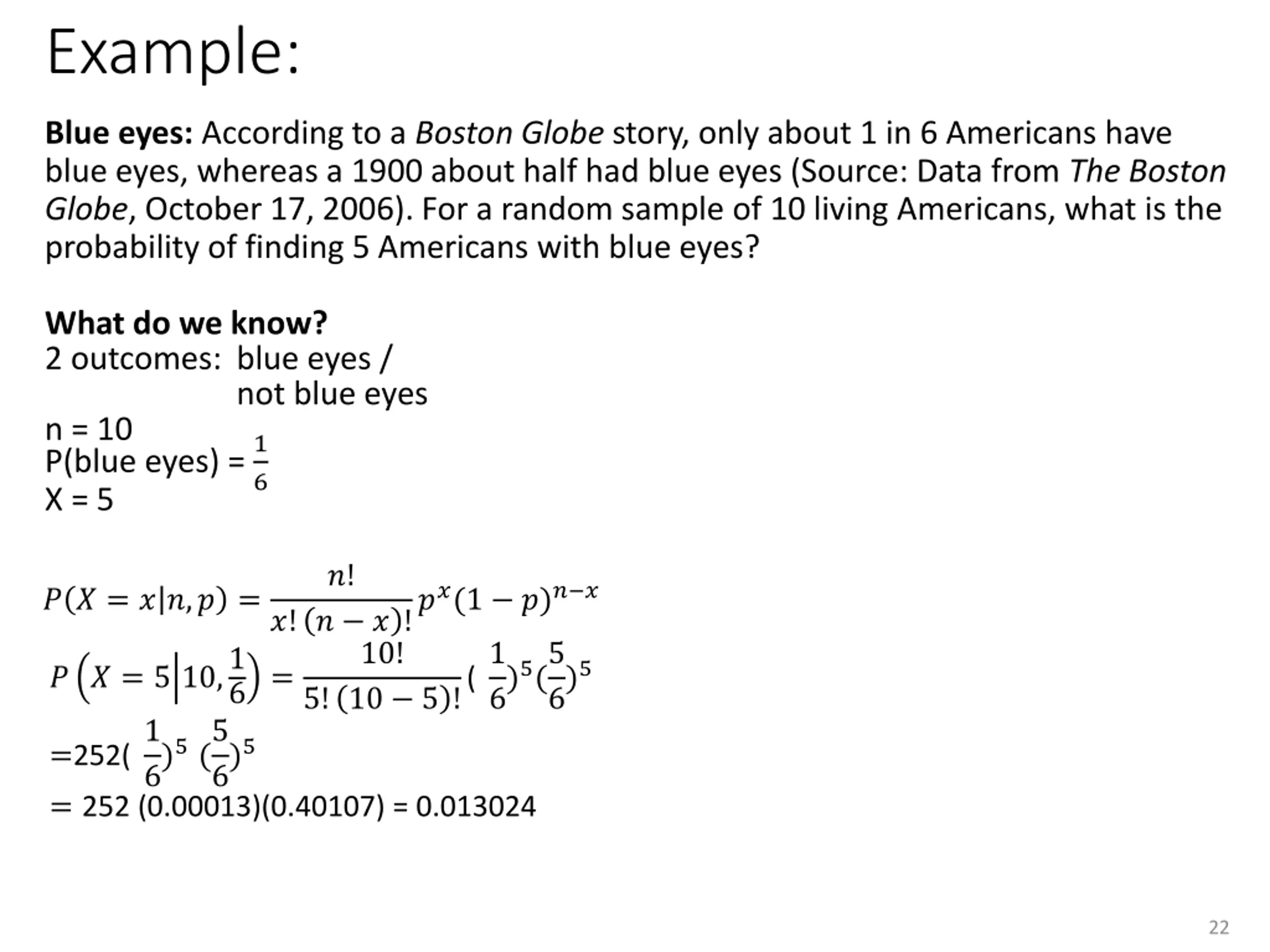 Example: Blue eyes: According to a Boston Globe story, only about 1 in 6 Americans have blue eyes, whereas a 1900 about half had blue eyes (Source: Data from The Boston Globe, October 17, 2006). For a random sample of 10 living Americans, what is the probability of finding 5 Americans with blue eyes? What do we know? 2 outcomes: blue eyes / not blue eyes n = 10 P(blue eyes) = 1 X = 5 6 ?! ?! ? ? !??(1 ?)? ? 10! 5! 10 5 !(1 ? ? = ? ?,? = 6)5(5 ? ? = 5 10,1 6)5 = 6 =252(1 6)5(5 6)5 = 252 (0.00013)(0.40107) = 0.013024 22