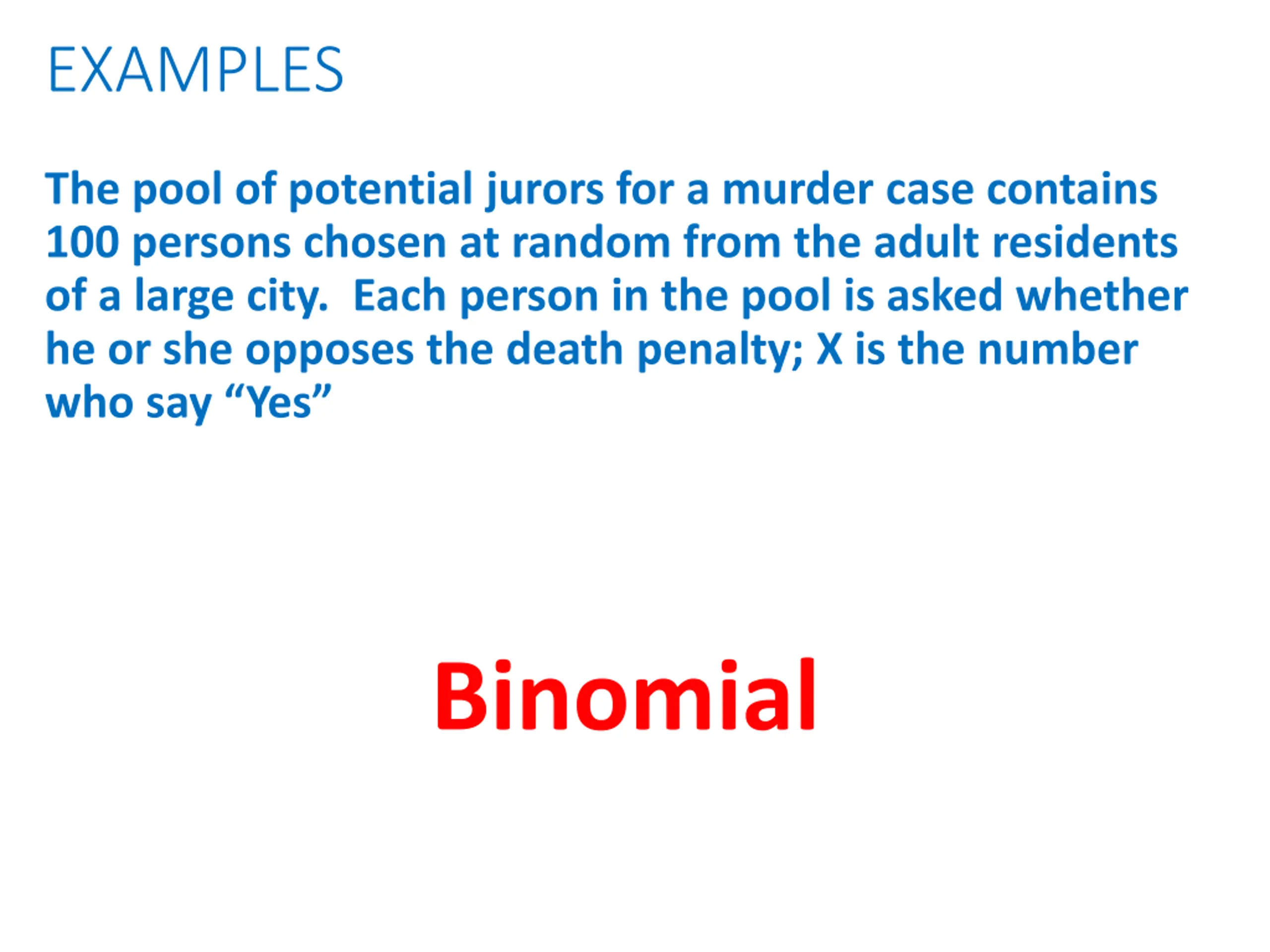 EXAMPLES The pool of potential jurors for a murder case contains 100 persons chosen at random from the adult residents of a large city. Each person in the pool is asked whether he or she opposes the death penalty; X is the number who say Yes Binomial