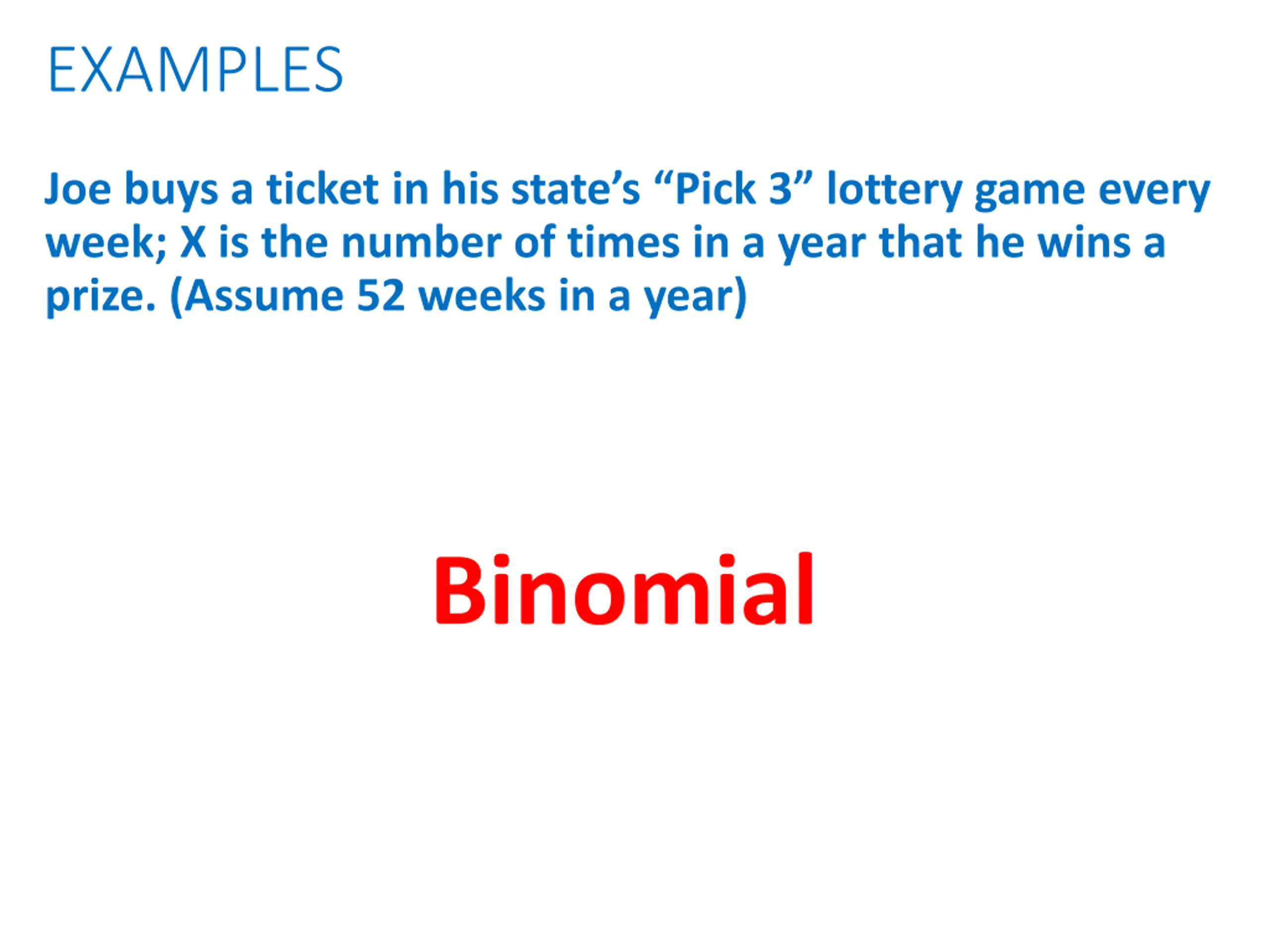 EXAMPLES Joe buys a ticket in his state s Pick 3 lottery game every week; X is the number of times in a year that he wins a prize. (Assume 52 weeks in a year) Binomial