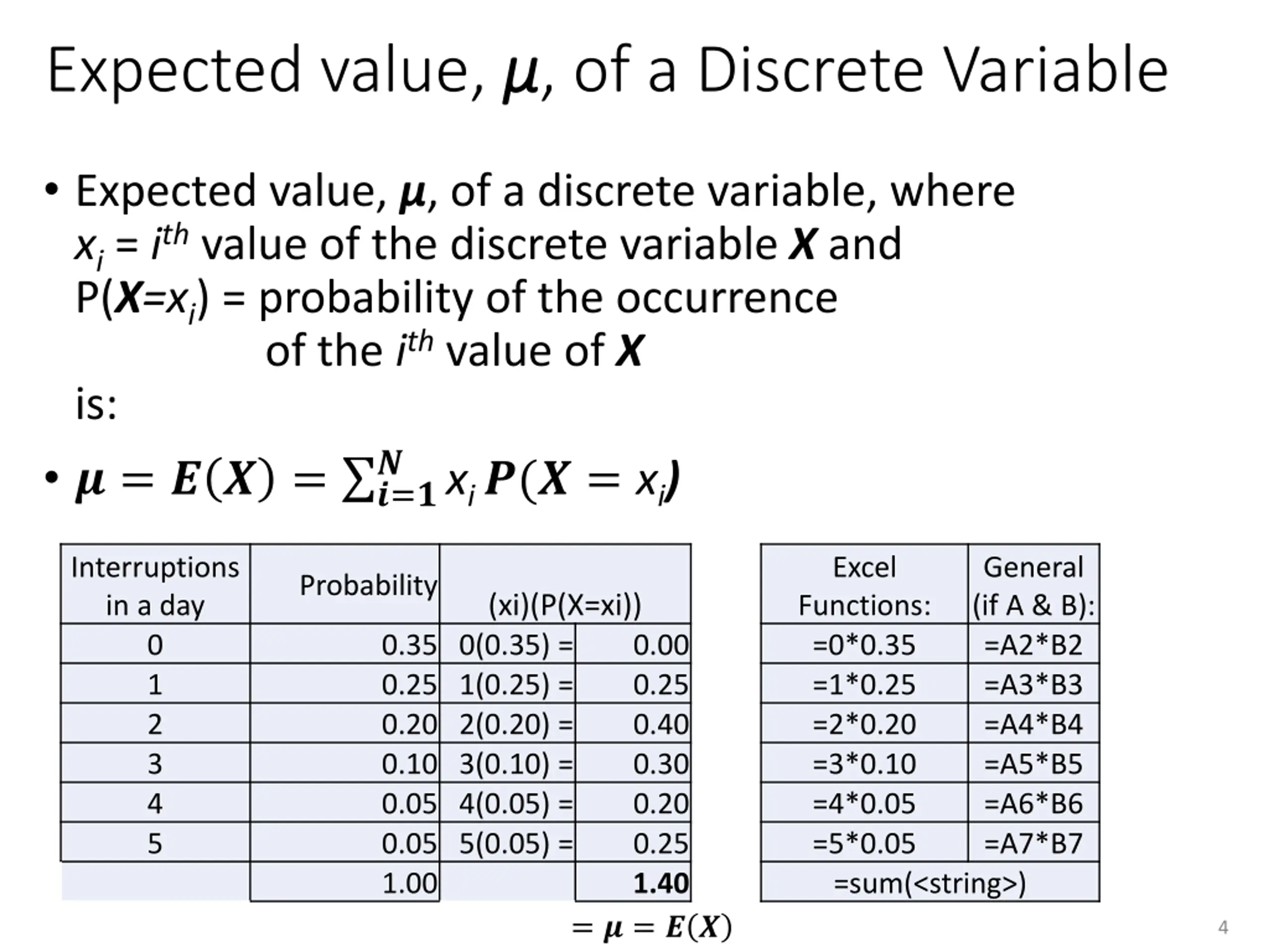 Expected value, , of a Discrete Variable Expected value, , of a discrete variable, where xi = ith value of the discrete variable X and P(X=xi) = probability of the occurrence of the ith value of X is: ? = ? ? = ?=? xi?(? = xi) ? Interruptions in a day 0 1 2 3 4 5 Excel Functions: =0*0.35 =1*0.25 =2*0.20 =3*0.10 =4*0.05 =5*0.05 =sum(<string>) General (if A & B): =A2*B2 =A3*B3 =A4*B4 =A5*B5 =A6*B6 =A7*B7 Probability (xi)(P(X=xi)) 0.35 0(0.35) = 0.25 1(0.25) = 0.20 2(0.20) = 0.10 3(0.10) = 0.05 4(0.05) = 0.05 5(0.05) = 1.00 0.00 0.25 0.40 0.30 0.20 0.25 1.40 = ? = ? ? 4