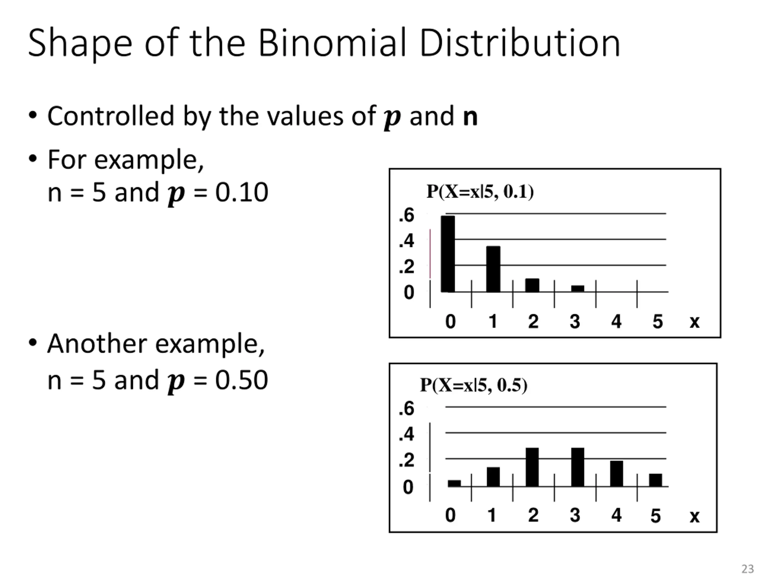 Shape of the Binomial Distribution Controlled by the values of ? and n For example, n = 5 and ? = 0.10 P(X=x|5, 0.1) .6 .4 .2 0 1 x 0 2 3 4 5 Another example, n = 5 and ? = 0.50 P(X=x|5, 0.5) .6 .4 .2 0 0 1 2 3 4 5 x 23