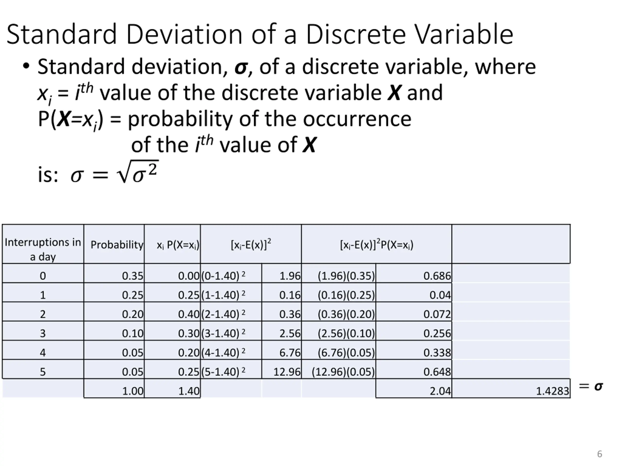 Standard Deviation of a Discrete Variable Standard deviation, , of a discrete variable, where xi = ith value of the discrete variable X and P(X=xi) = probability of the occurrence of the ith value of X is: ? = ?2 Interruptions in a day [xi-E(x)]2 [xi-E(x)]2P(X=xi) Probability xi P(X=xi) 0.00(0-1.40) 2 0 0.35 1.96 (1.96)(0.35) 0.686 0.25(1-1.40) 2 1 0.25 0.16 (0.16)(0.25) 0.04 0.40(2-1.40) 2 2 0.20 0.36 (0.36)(0.20) 0.072 0.30(3-1.40) 2 3 0.10 2.56 (2.56)(0.10) 0.256 0.20(4-1.40) 2 4 0.05 6.76 (6.76)(0.05) 0.338 0.25(5-1.40) 2 5 0.05 12.96 (12.96)(0.05) 0.648 = 1.00 1.40 2.04 1.4283 6