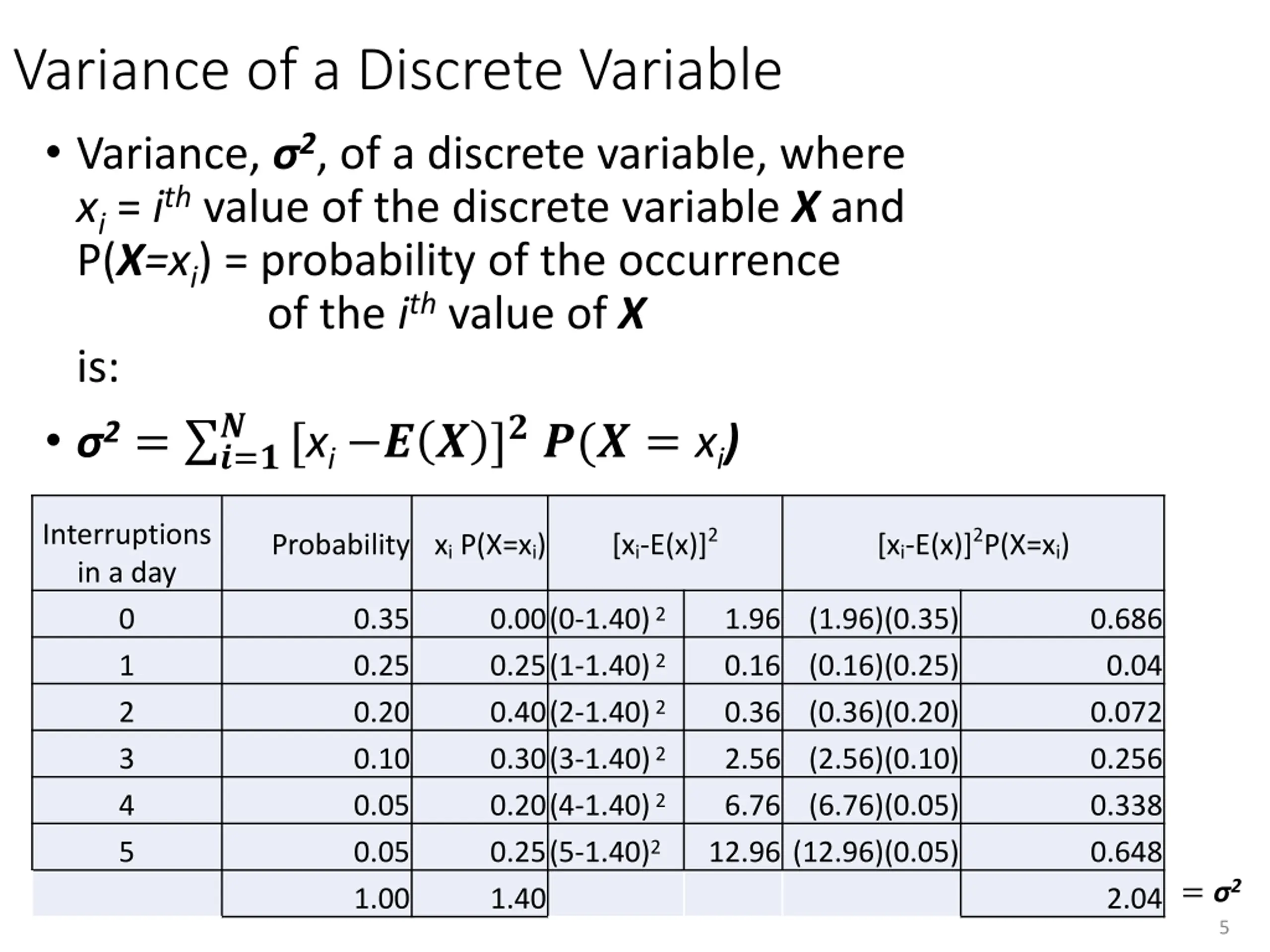 Variance of a Discrete Variable Variance, 2, of a discrete variable, where xi = ith value of the discrete variable X and P(X=xi) = probability of the occurrence of the ith value of X is: 2= ?=? [xi ? ? ]??(? = xi) ? Interruptions in a day 0 1 2 3 4 5 [xi-E(x)]2 [xi-E(x)]2P(X=xi) Probability xi P(X=xi) 0.00(0-1.40) 2 0.25(1-1.40) 2 0.40(2-1.40) 2 0.30(3-1.40) 2 0.20(4-1.40) 2 0.25(5-1.40)2 1.40 0.35 0.25 0.20 0.10 0.05 0.05 1.00 1.96 (1.96)(0.35) 0.16 (0.16)(0.25) 0.36 (0.36)(0.20) 2.56 (2.56)(0.10) 6.76 (6.76)(0.05) 12.96 (12.96)(0.05) 0.686 0.04 0.072 0.256 0.338 0.648 2.04= 2 5
