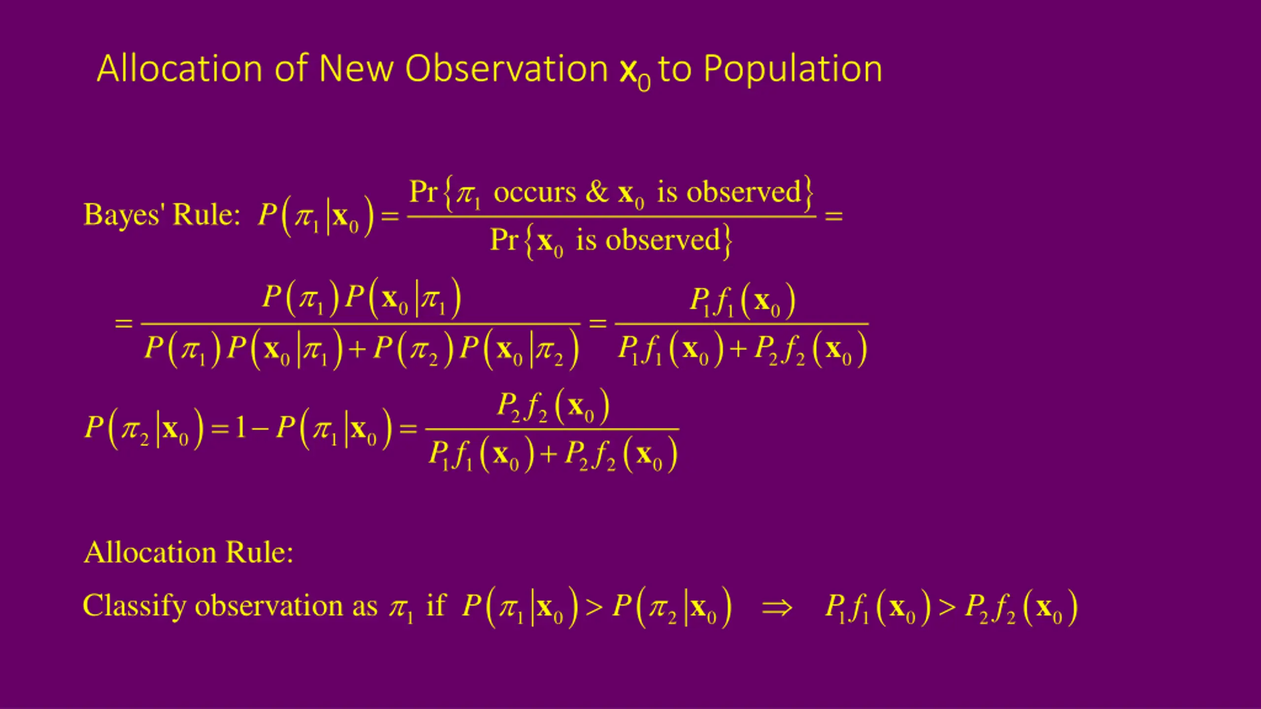 Allocation of New Observation x x0to Population x Pr occurs & Pr x is observed ( ) = = 1 0 x Bayes' Rule: P 1 0 is observed 0 ( ) ( 1 ) ( ) x P x P + x 1 1 P f x 0 1 = = 0 ( ) ( 1 ) ) ( P ) x ( ) ( ) ( + x x 1 1 P f P f P P P 0 2 2 0 0 1 2 0 2 ( ) P f x ( ) ( ) = = 2 2 + 0 x x 1 P P ( ) ( ) 2 0 1 0 x 1 1 P f P f 0 2 2 0 Allocation Rule: ( ) ( ) ( ) ( ) x x x x Classify observation as if P P 1 1 P f P f 1 1 0 2 0 0 2 2 0