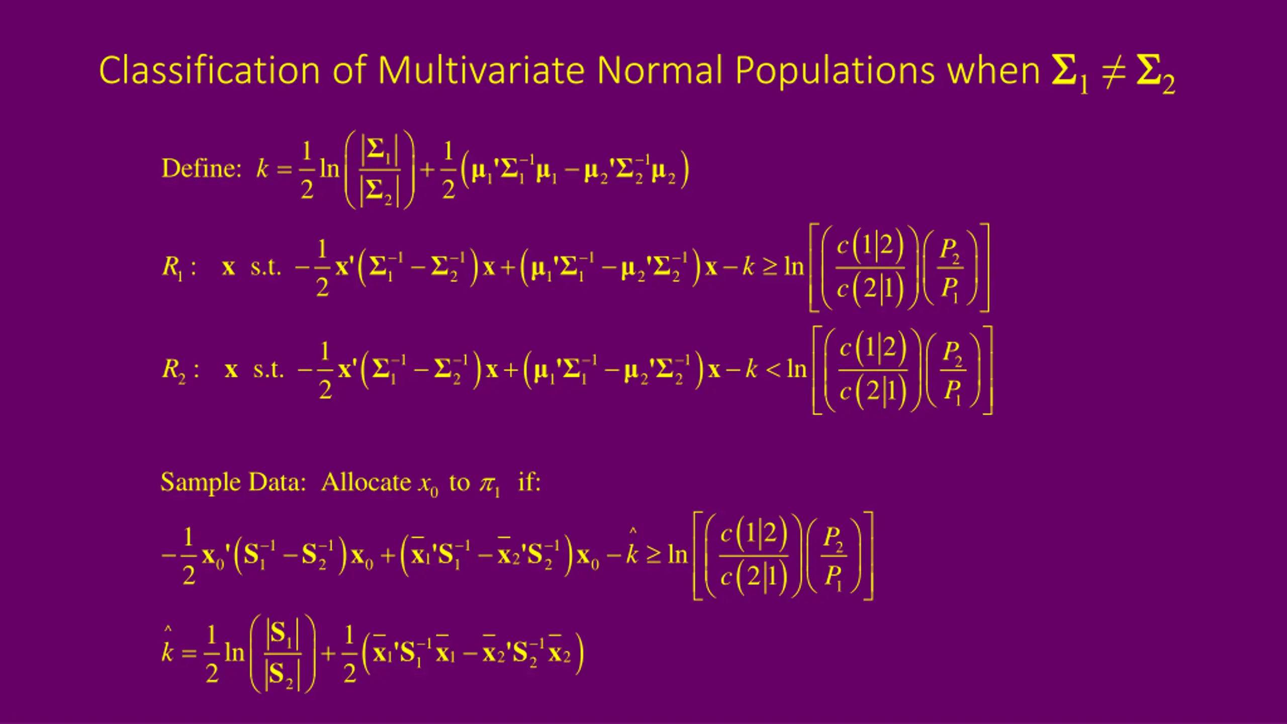 Classification of Multivariate Normal Populations when 1 2 1 2 ( ) = + 1 1 1 Define: ln k ' ' 1 1 1 2 2 2 2 ( ( ( ( ) ) ) ) 1 2 21 c c 1 2 P P ( ) ( ) + 1 1 1 1 x x' : s.t. ln R k 2 x ' ' x 1 1 2 1 1 2 2 1 1 2 21 c c 1 2 P P ( ) ( ) + 1 1 1 1 x x' : s.t. ln R k 2 x ' ' x 2 1 2 1 1 2 2 1 Sample Data: Allocate to if: x 0 1 ( ( ) ) 1 2 21 c c ( ) 1 2 P P ( ) ^ k + 1 1 1 1 x ' S S x x 'S x 'S x ln 2 1 2 0 1 2 0 1 2 0 1 S S ( ) 1 2 1 2 ^ k = + 1 1 1 x 'S x x 'S x ln 1 1 2 2 1 2 2