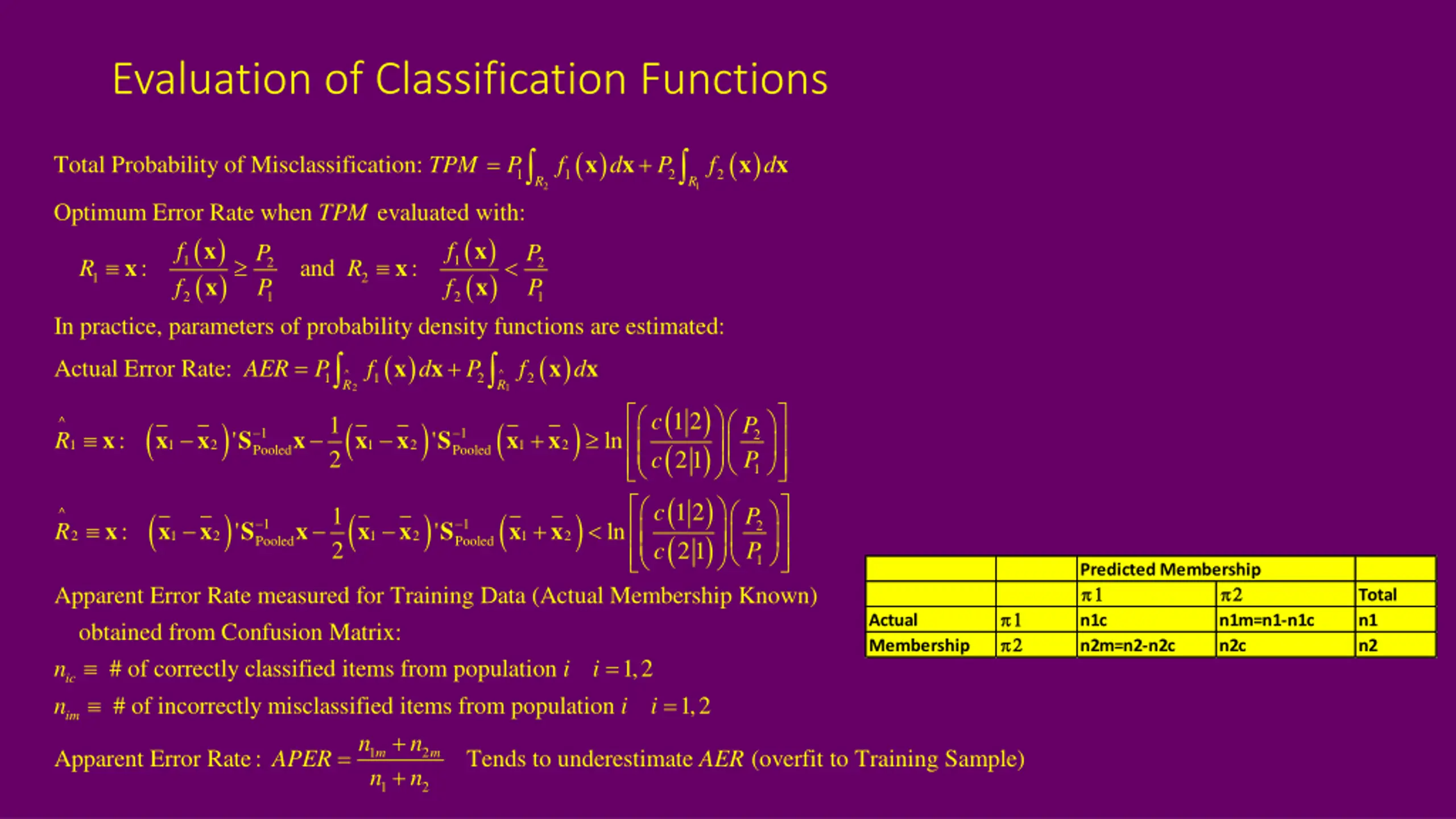Evaluation of Classification Functions ( ) x ( ) x = + x x Total Probability of Misclassification: TPM P f d P f d 1 1 2 2 R R 2 1 Optimum Error Rate when f R f evaluated with: f f TPM ( ) ( ) x ( ) ( ) x x x P P P P 1 1 x x : and : R 2 2 1 2 2 1 2 1 In practice, parameters of probability density funct ions are estimated: ( ) x ( ) x = + x x Actual Error Rate: AER P f d P f d ^ R ^ R 1 1 2 2 2 1 ( ( ( ( ) ) ) ) 1 2 21 c c ( ) ( ) ( ) 1 2 P P ^ + 1 1 x x x S x x x S x x : ' ' ln R 2 1 1 2 1 2 1 2 Pooled Pooled 1 1 2 21 c c ( ) ( ) ( ) 1 2 P P ^ + 1 1 x x x S x x x S x x : ' ' ln R 2 2 1 2 1 2 1 2 Pooled Pooled 1 Predicted Membership n1c n2m=n2-n2c Apparent Error Rate measured for Training Data (Actual Membership Known) obtained from Confusion Matrix: # of correctly classified items from population # im n of incorrectly misclassified items from population n n APER n n + n1m=n1-n1c n2c Total n1 n2 Actual Membership = 1,2 i n i i ic = 1,2 i + = Apparent Error Rate: Tends to underestimate (overfit to Training Sample) 1 2 m m AER 1 2
