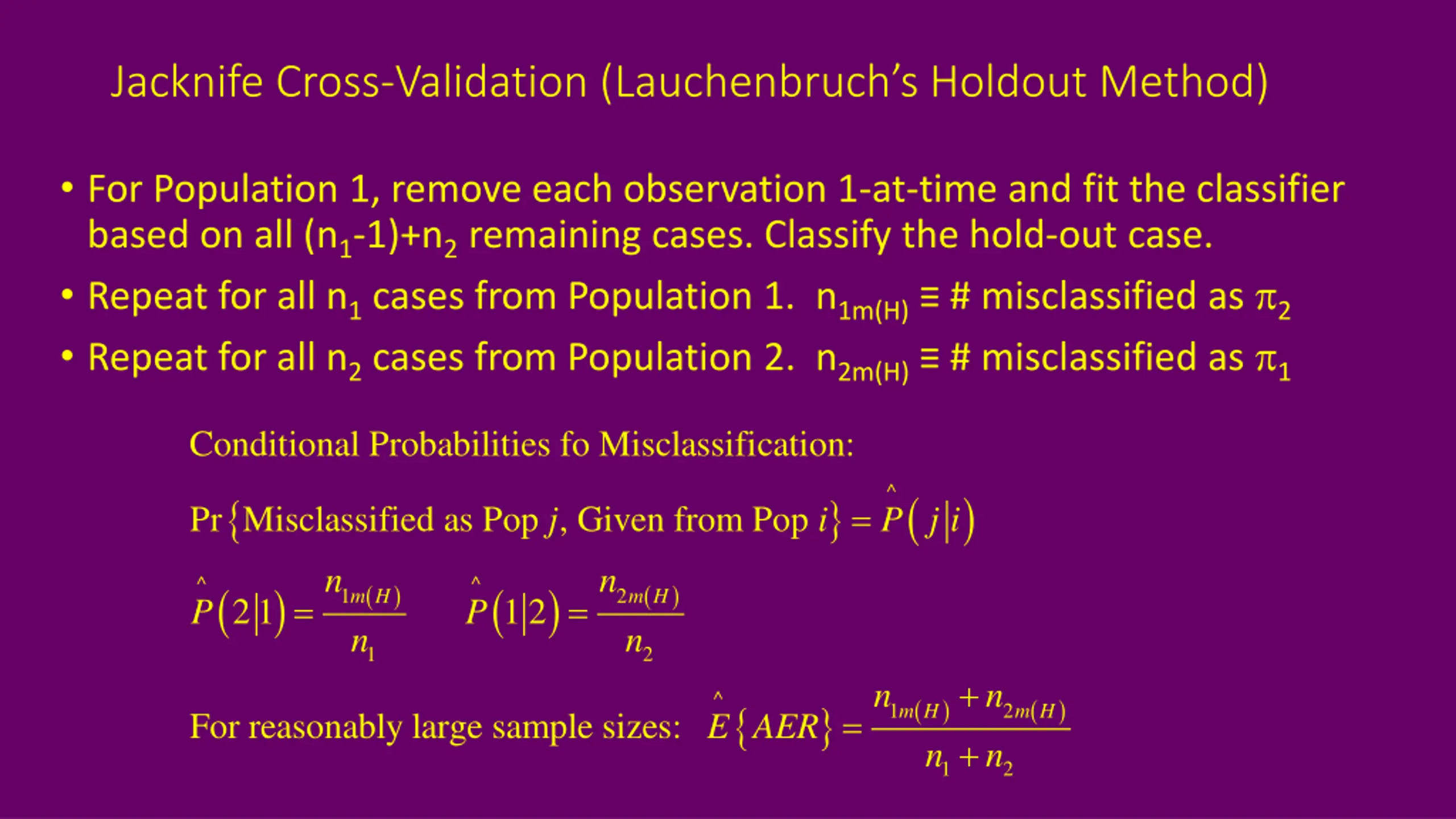 Jacknife Cross-Validation (Lauchenbruchs Holdout Method) For Population 1, remove each observation 1-at-time and fit the classifier based on all (n1-1)+n2remaining cases. Classify the hold-out case. Repeat for all n1cases from Population 1. n1m(H) # misclassified as 2 Repeat for all n2cases from Population 2. n2m(H) # misclassified as 1 Conditional Probabilities fo Misclassification: ^ ( ) = Pr Misclassified as Pop , Given from Pop j i P j i n n ^ ^ ( ) ( ) ( ) m H n ( ) m H n 1 2 = = 21 1 2 P P 1 2 + + n n ^ ( ) m H ( ) m H 1 2 = For reasonably large sample sizes: E AER n n 1 2