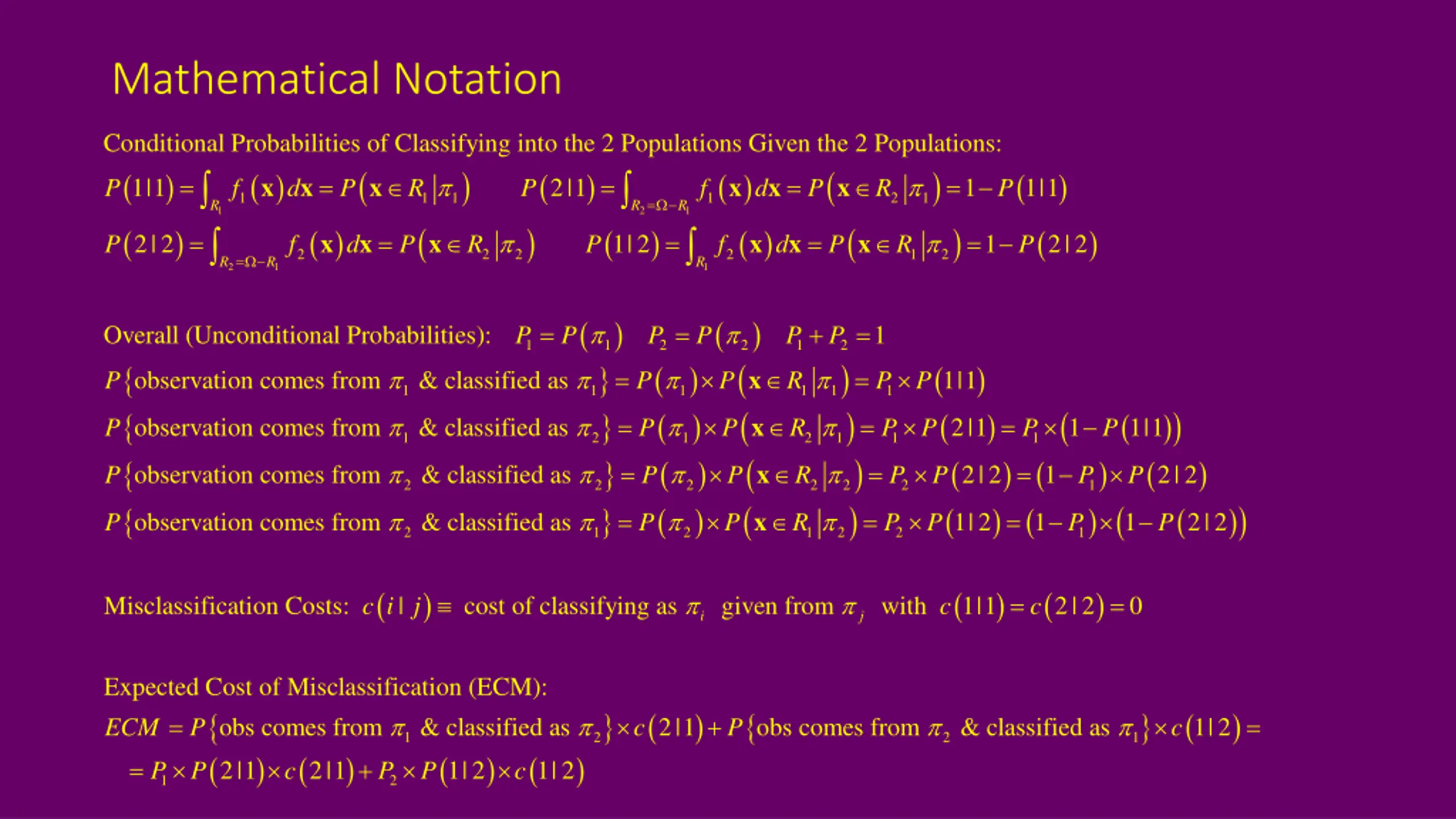 Mathematical Notation Conditional Probabilities of Classifying into the 2 Populations Given the 2 Populations: ( ) ( ) ( ) ( ) x ( ) ( ) x ( ) = = = = = x x x x 1|1 2|1 1 1|1 P f d P R P f d P R P 1 1 1 1 2 1 = R R R 1 2 1 ( ) ( ) ( ) ( ) x ( ) ( ) x ( ) = = = = = x x x x 2|2 1|2 1 2|2 P f d P R P f d P R P 2 2 2 2 1 2 = R R R 2 1 1 ( ) 2 ( P ) x = = + = Over P P all (Unconditional Probabilities): 1 P P P P P P 1 1 2 2 1 2 ( ( ) ( ) ( ) ( ( ( ) = = observation comes from & classified as 1|1 P P R P P 1 1 1 1 1 1 ) ( ) ( ) ( ) = ) ) = ) ) = ) ( ) ( = x ( ( observation comes from & classified as 2|1 ( ( 1|2 1 1|1 P P R P P P P ) 1 1 2 1 1 1 ( ) = = = x observ ation comes from & classified as 2|2 1 2|2 P P P R P P P P 2 2 2 2 2 2 1 ( ) ) ( ) = = x observation comes from & classified as 1 1 2|2 P P R P P P P 2 1 2 1 2 2 1 ( ) ( ) ( ) = = Misclassification Costs: | cost of classifying as given from with 1|1 2|2 0 c i j c c i j Expected Cost of Misclassification (ECM): obs comes from ECM P = = ( ( ) ( ) + = & classified as 2|1 obs comes from & classified as 1|2 c P c 1 2 2 1 ) ( ) ( ) ( ) + 2|1 2|1 1|2 1|2 P P c P P c 1 2