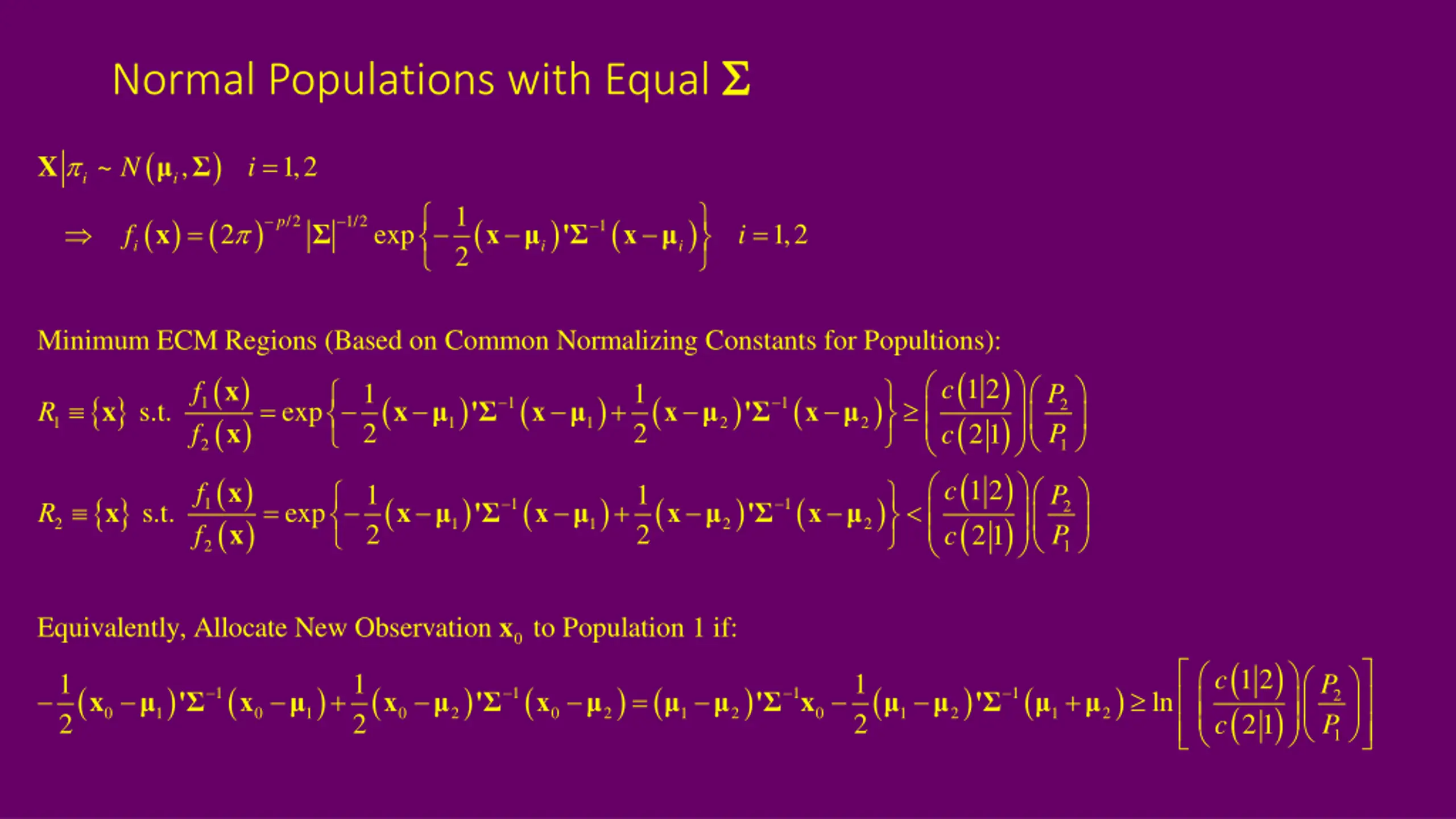 Normal Populations with Equal ( ) = X ~ , 1,2 N i i i 1 2 ( ) ( x ) ( ) ( ) 1/2 /2 p = = 1 2 exp 1,2 f i x ' x i i i Minimum ECM Regions (Based on Common Normalizing Constants for Popultions): ( ( ( ( ) ) ) ) ( ) ( ) x ( ) ( ) x 1 2 21 c c x f f 1 2 1 2 P P x ( ) ( ) ( ) ( ) = + 1 1 1 x ' s.t. exp R 2 x x ' x 1 1 1 2 2 2 1 1 2 21 c c x f f 1 2 1 2 P P x ( ) ( ) ( ) ( ) = + 1 1 1 x ' s.t. exp R 2 x x ' x 2 1 1 2 2 2 1 x Equivalently, Allocate New Observation to Population 1 if: 0 ( ( ) ) 1 2 21 c c 1 2 1 2 1 2 P P ( ) ( ) ( ) ( ) ( = ) ( ) ( ) + + 1 1 1 1 x x ln 2 ' x x ' x ' ' 0 1 0 1 0 2 0 2 1 2 0 1 2 1 2 1
