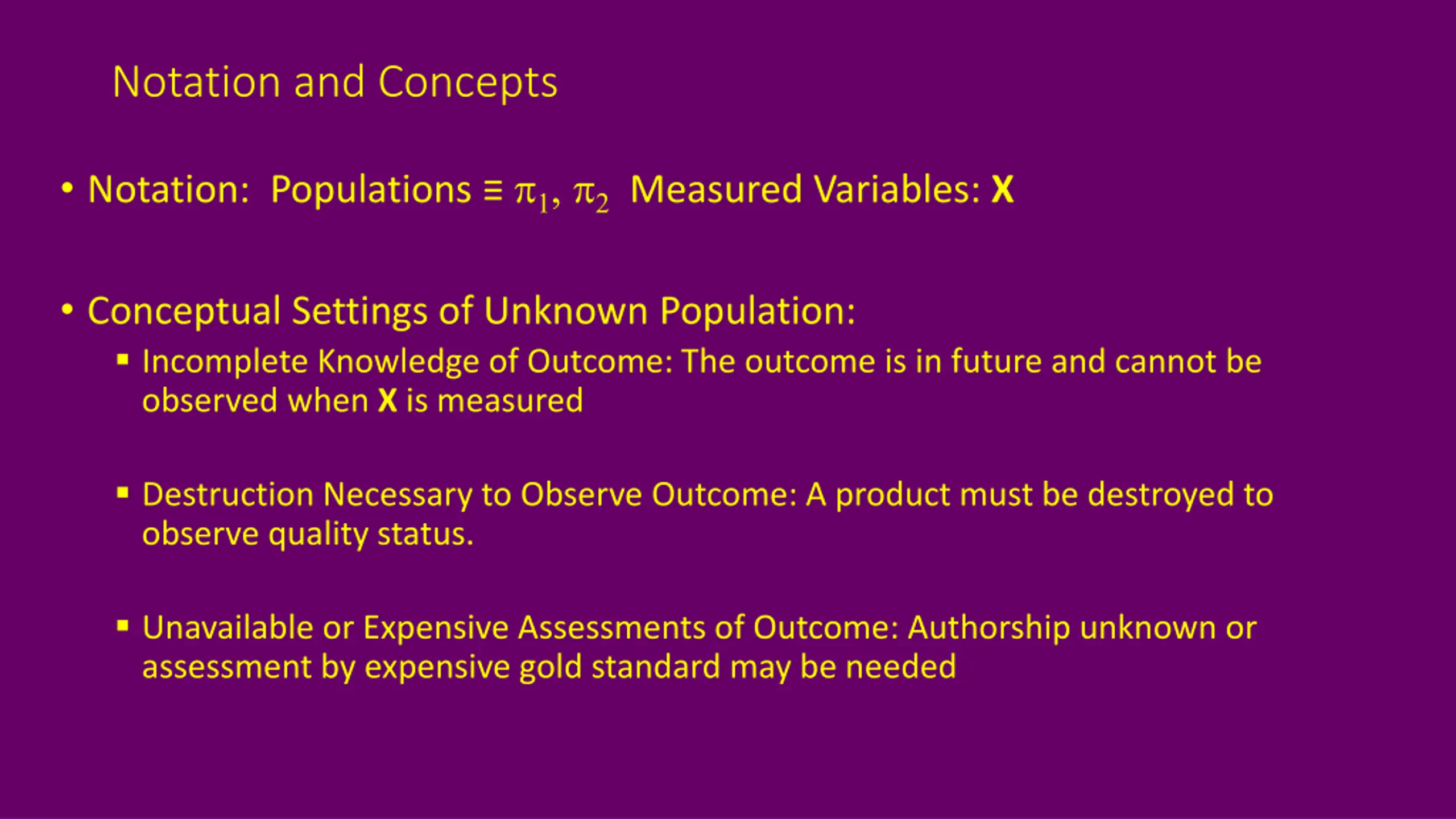 Notation and Concepts Notation: Populations Measured Variables: X Conceptual Settings of Unknown Population: Incomplete Knowledge of Outcome: The outcome is in future and cannot be observed when X is measured Destruction Necessary to Observe Outcome: A product must be destroyed to observe quality status. Unavailable or Expensive Assessments of Outcome: Authorship unknown or assessment by expensive gold standard may be needed