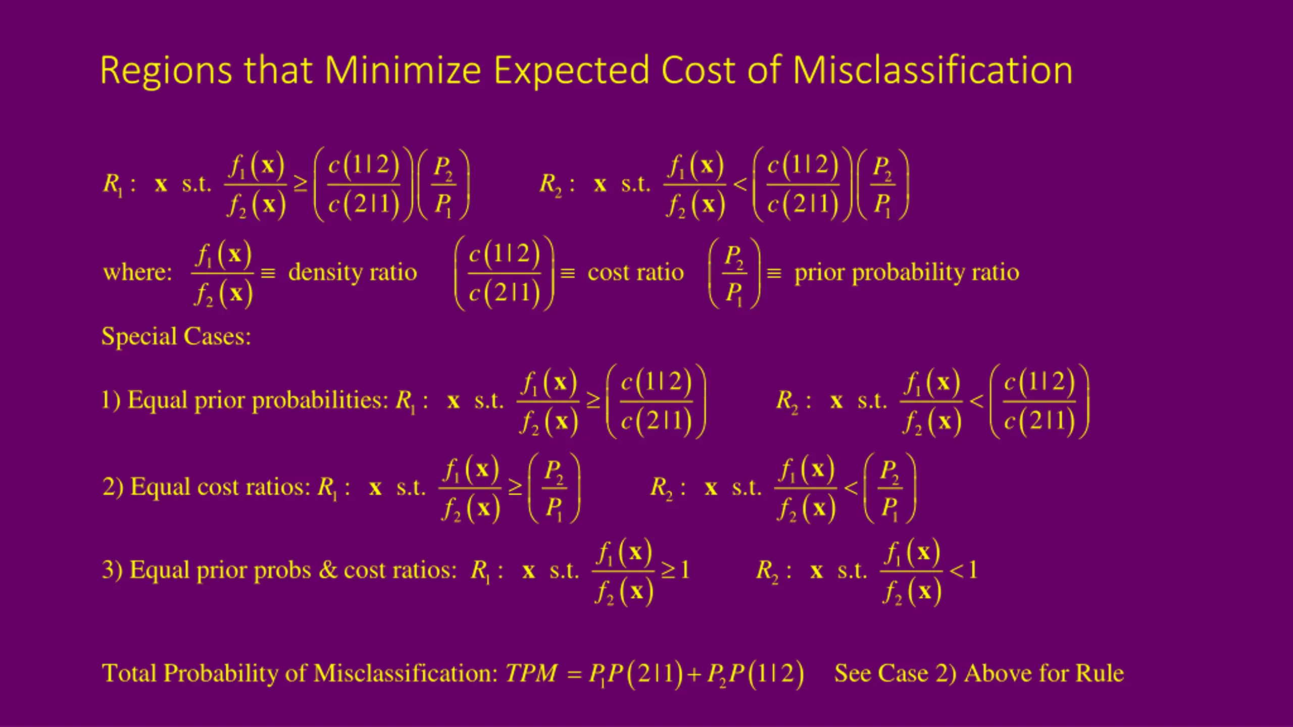 Regions that Minimize Expected Cost of Misclassification ( ) ( ) x ( ( ) ) ( ) ( ) x ( ( ) ) x x 1|2 2|1 1|2 2|1 f f c c f f c c P P P P 1 1 : s.t. x : s.t. x R R 2 2 1 2 2 1 2 1 ( ) ( ) x ( ( ) ) x 1|2 2|1 f f c c P P 1 where: density ratio cost ratio prior probability rat io 2 2 1 Special Cases: ( ) ( ) x ( ( ) ) ( ) ( ) x ( ( ) ) x x 1|2 2|1 1|2 2|1 f f c c f f c c 1 1 : s.t. x : s.t. x 1) Equal prior probabilities: R R 1 2 2 2 ( ) ( ) x ( ) ( ) x x x f f f f P P P P 1 1 : s.t. x : s. x 2) Equal cost ratios: t. R R 2 2 1 2 2 1 2 1 ( ) ( ) x ( ) ( ) x x x f f f f 1 1 : s.t. x : s.t. x 3) Equal prior probs & cost ratios: 1 1 R R 1 2 2 2 ( ) ( ) = + Total Probability of Misclassification: 2|1 1|2 See Case 2) Above for Rule TPM PP P P 1 2