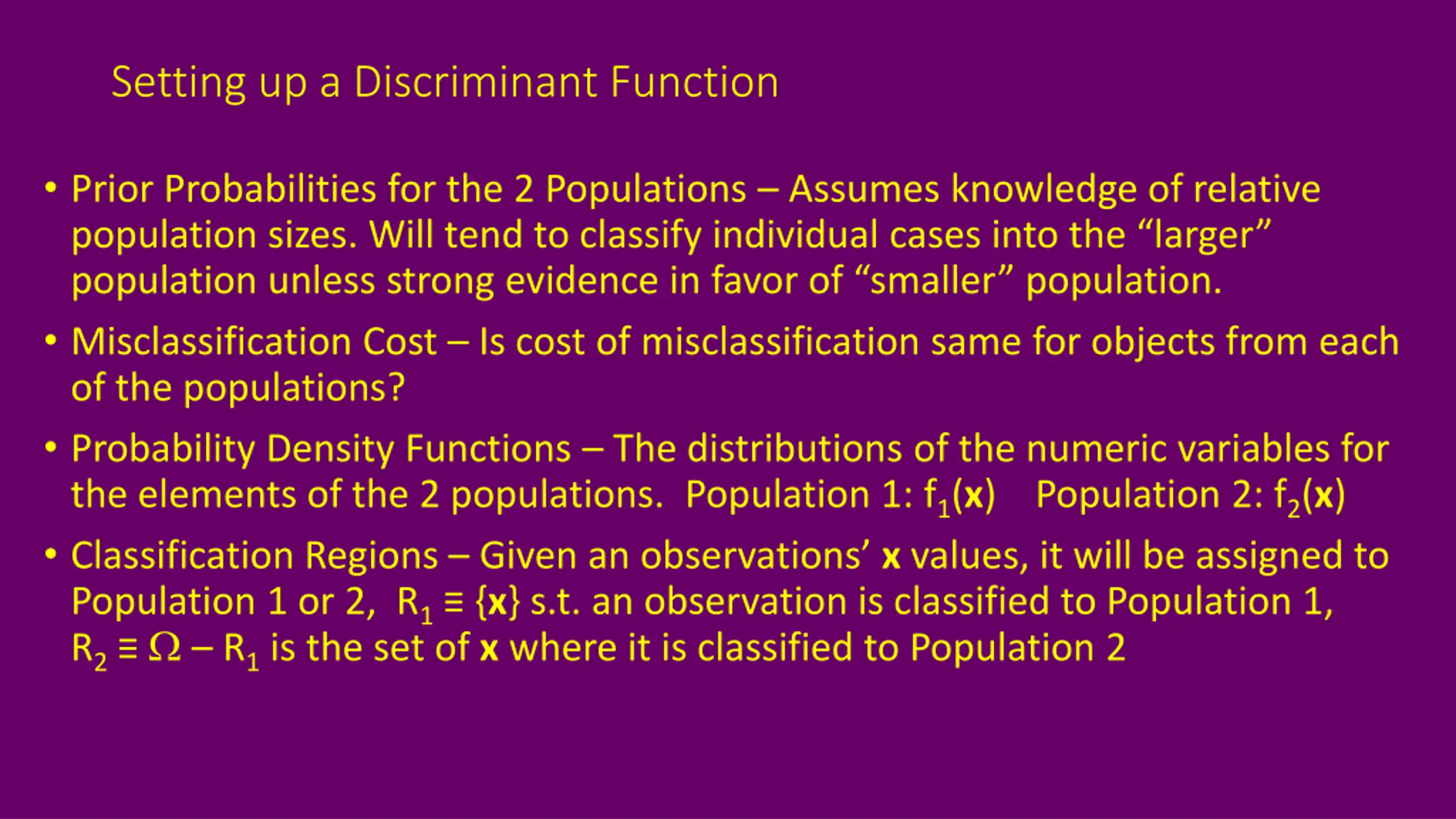 Setting up a Discriminant Function Prior Probabilities for the 2 Populations Assumes knowledge of relative population sizes. Will tend to classify individual cases into the larger population unless strong evidence in favor of smaller population. Misclassification Cost Is cost of misclassification same for objects from each of the populations? Probability Density Functions The distributions of the numeric variables for the elements of the 2 populations. Population 1: f1(x) Population 2: f2(x) Classification Regions Given an observations x values, it will be assigned to Population 1 or 2, R1 {x} s.t. an observation is classified to Population 1, R2 R1is the set of x where it is classified to Population 2