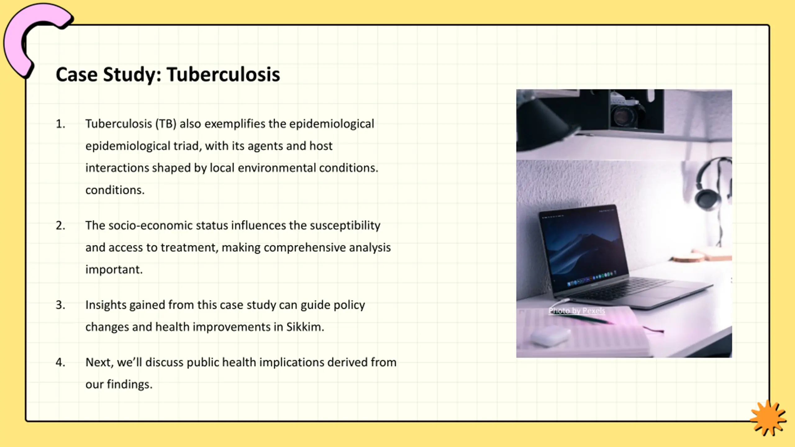 Case Study: Tuberculosis 1. Tuberculosis (TB) also exemplifies the epidemiological epidemiological triad, with its agents and host interactions shaped by local environmental conditions. conditions. 2. The socio-economic status influences the susceptibility and access to treatment, making comprehensive analysis important. 3. Insights gained from this case study can guide policy Photo by Pexels changes and health improvements in Sikkim. 4. Next, we ll discuss public health implications derived from our findings.