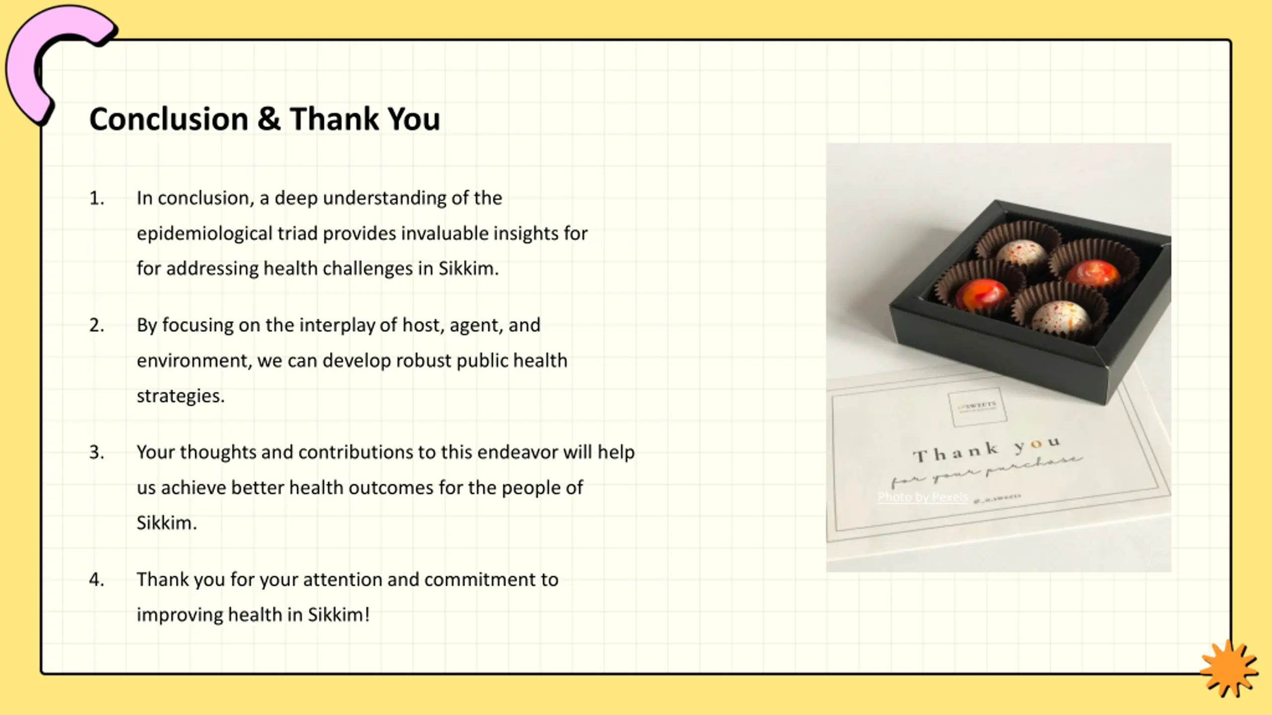 Conclusion & Thank You 1. In conclusion, a deep understanding of the epidemiological triad provides invaluable insights for for addressing health challenges in Sikkim. 2. By focusing on the interplay of host, agent, and environment, we can develop robust public health strategies. 3. Your thoughts and contributions to this endeavor will help us achieve better health outcomes for the people of Photo by Pexels Sikkim. 4. Thank you for your attention and commitment to improving health in Sikkim!