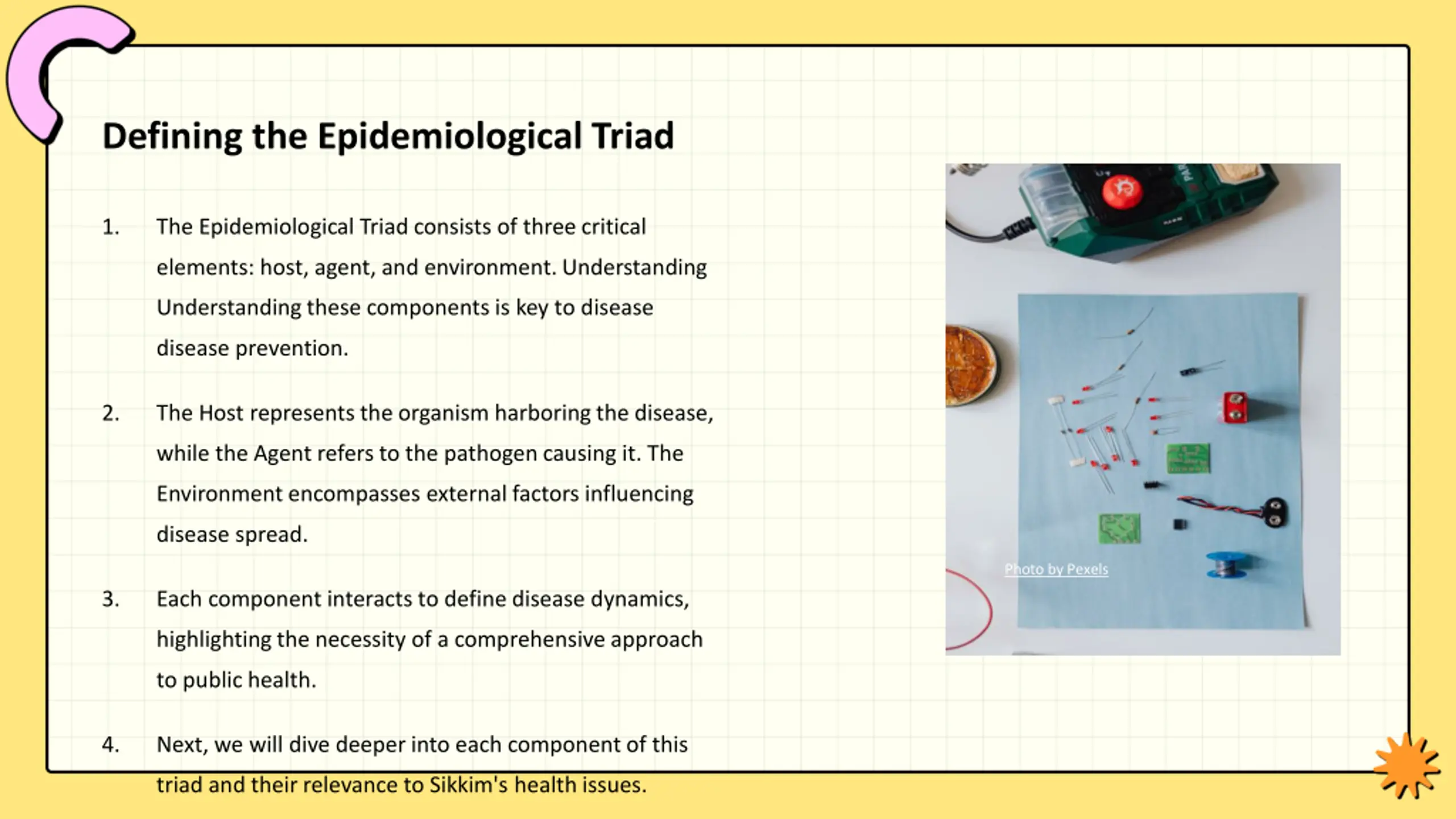 Unraveling Disease Dynamics 1. The Epidemiological Triad is essential for understanding disease dynamics in any population. It involves the interplay of host, agent, and environment. 2. In this presentation, we will explore these components as they relate to Sikkim, a region with unique health challenges. 3. Our journey will reveal insights into public health interventions and disease prevention strategies tailored Photo by Pexels for Sikkim. 4. Let's embark on this informative exploration of the epidemiological triad in the context of Sikkim's health landscape.
