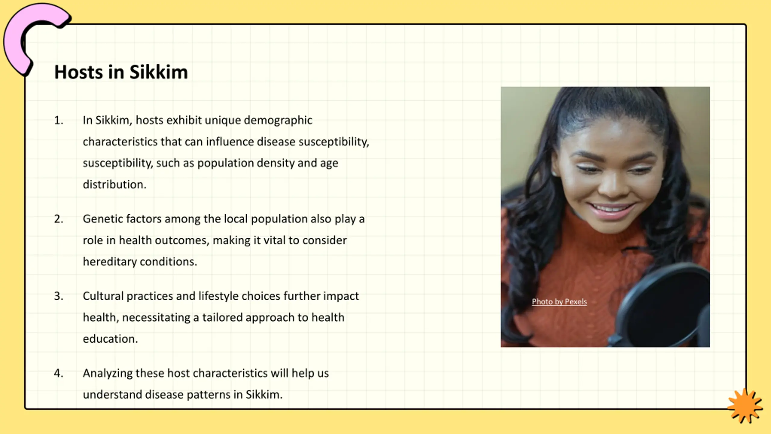 Hosts in Sikkim 1. In Sikkim, hosts exhibit unique demographic characteristics that can influence disease susceptibility, susceptibility, such as population density and age distribution. 2. Genetic factors among the local population also play a role in health outcomes, making it vital to consider hereditary conditions. 3. Cultural practices and lifestyle choices further impact Photo by Pexels health, necessitating a tailored approach to health education. 4. Analyzing these host characteristics will help us understand disease patterns in Sikkim.