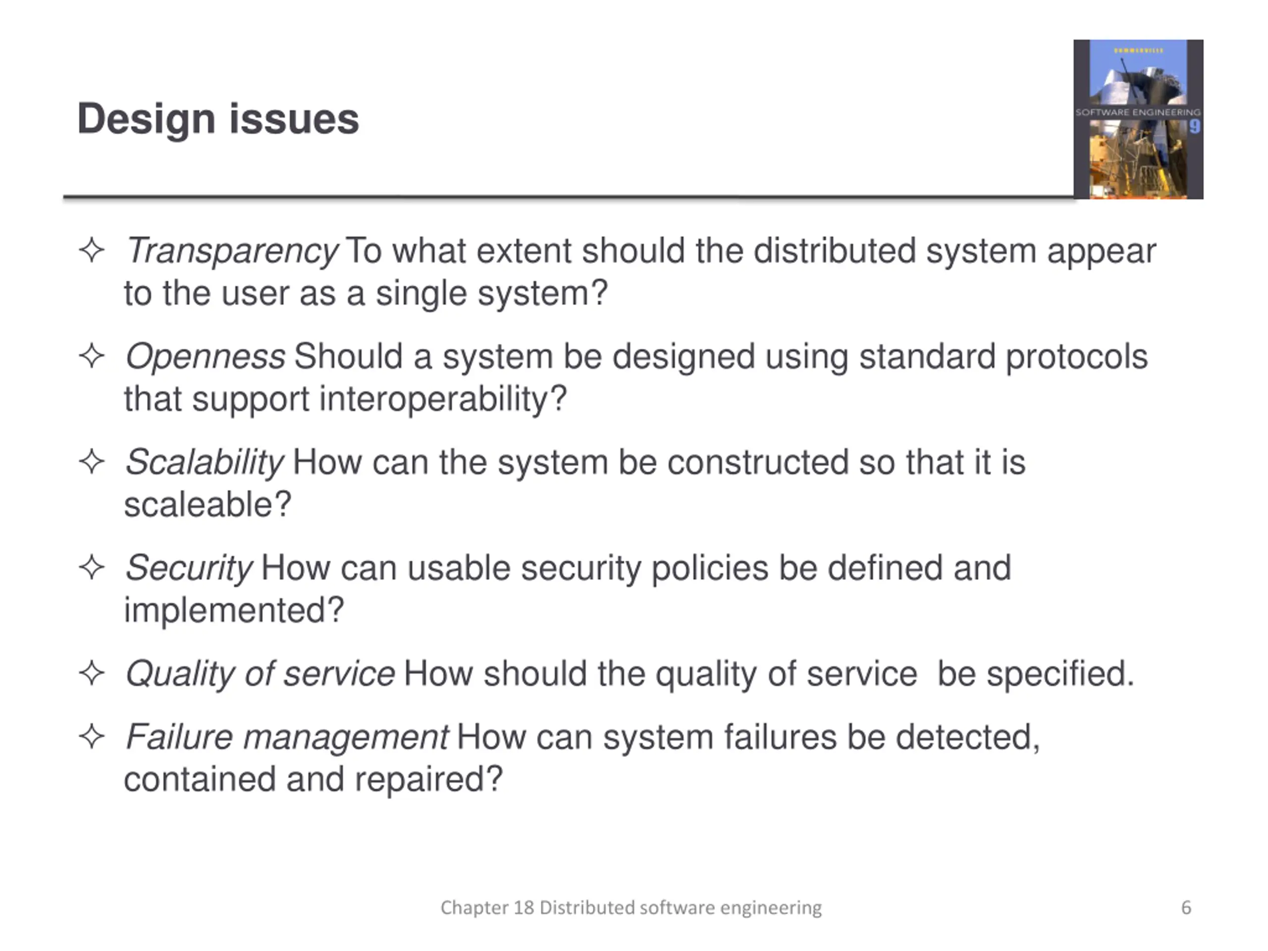 Distributed systems issues Distributed systems are more complex than systems that run on a single processor. Complexity arises because different parts of the system are independently managed as is the network. There is no single authority in charge of the system so top-down control is impossible. Chapter 18 Distributed software engineering 5