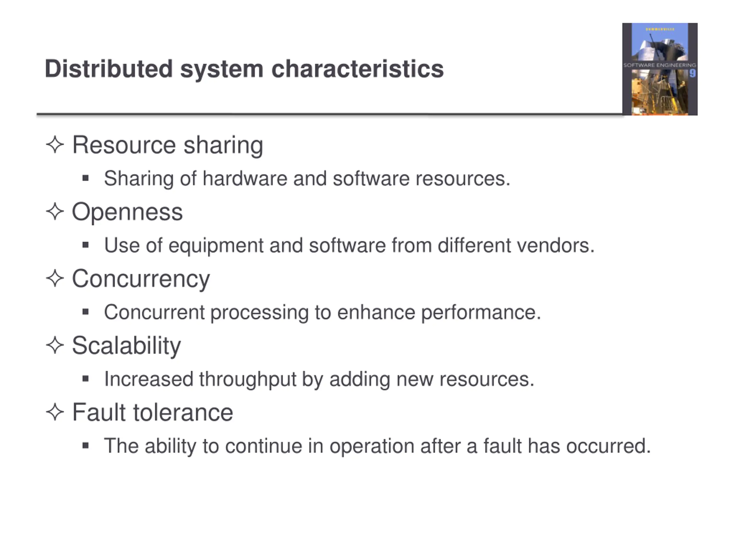 Distributed system characteristics Resource sharing Sharing of hardware and software resources. Openness Use of equipment and software from different vendors. Concurrency Concurrent processing to enhance performance. Scalability Increased throughput by adding new resources. Fault tolerance The ability to continue in operation after a fault has occurred.