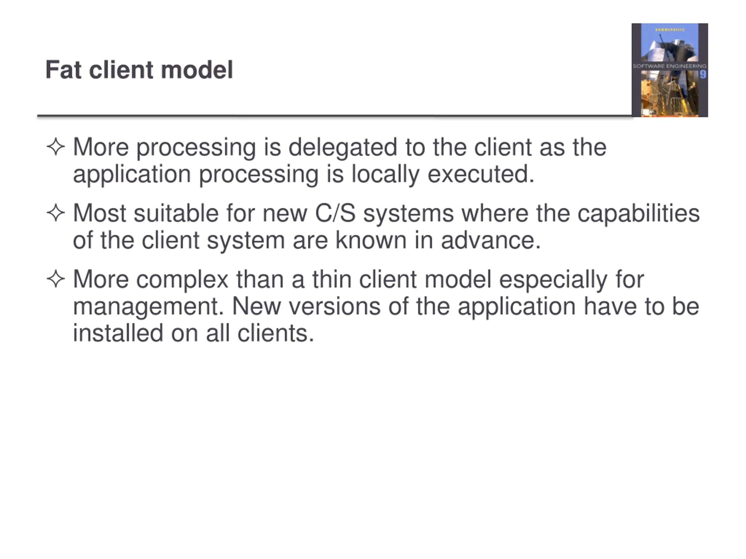 Fat client model More processing is delegated to the client as the application processing is locally executed. Most suitable for new C/S systems where the capabilities of the client system are known in advance. More complex than a thin client model especially for management. New versions of the application have to be installed on all clients.