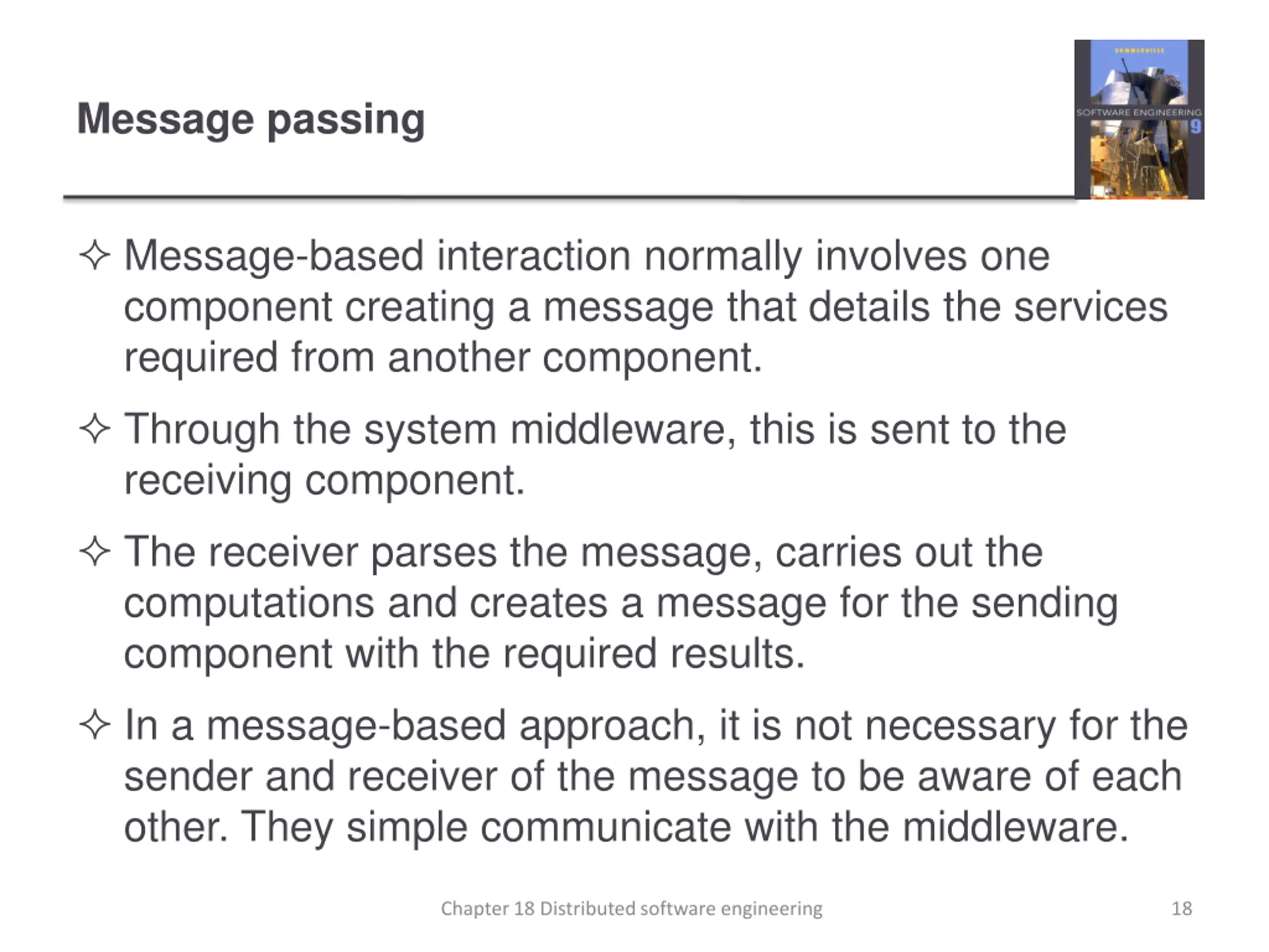 Message passing Message-based interaction normally involves one component creating a message that details the services required from another component. Through the system middleware, this is sent to the receiving component. The receiver parses the message, carries out the computations and creates a message for the sending component with the required results. In a message-based approach, it is not necessary for the sender and receiver of the message to be aware of each other. They simple communicate with the middleware. Chapter 18 Distributed software engineering 18