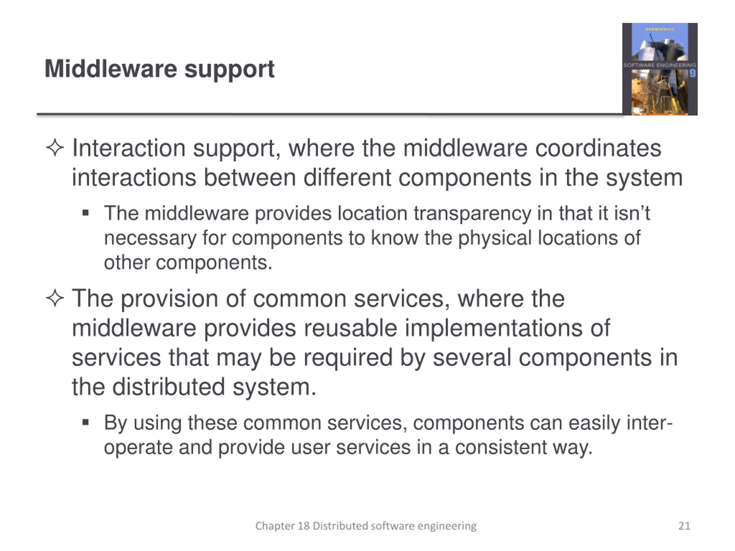 Middleware support Interaction support, where the middleware coordinates interactions between different components in the system The middleware provides location transparency in that it isn t necessary for components to know the physical locations of other components. The provision of common services, where the middleware provides reusable implementations of services that may be required by several components in the distributed system. By using these common services, components can easily inter- operate and provide user services in a consistent way. Chapter 18 Distributed software engineering 21