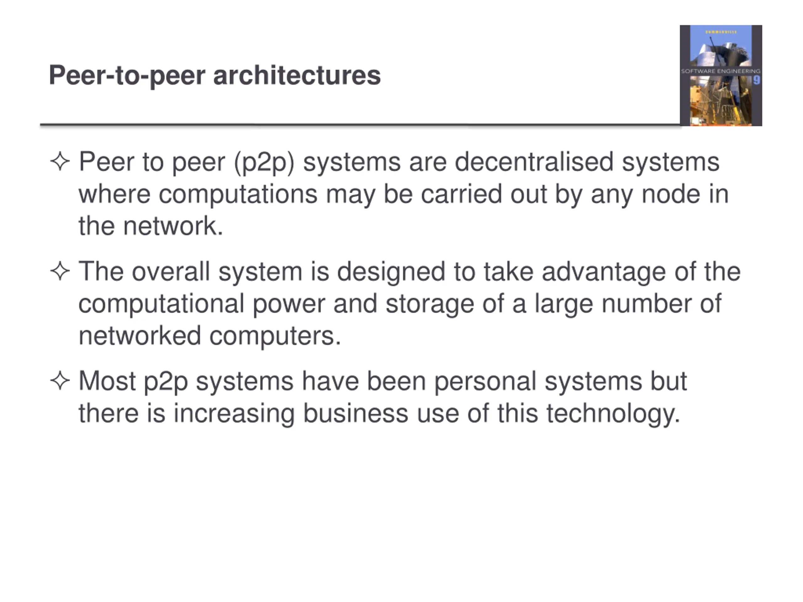 Peer-to-peer architectures Peer to peer (p2p) systems are decentralised systems where computations may be carried out by any node in the network. The overall system is designed to take advantage of the computational power and storage of a large number of networked computers. Most p2p systems have been personal systems but there is increasing business use of this technology.
