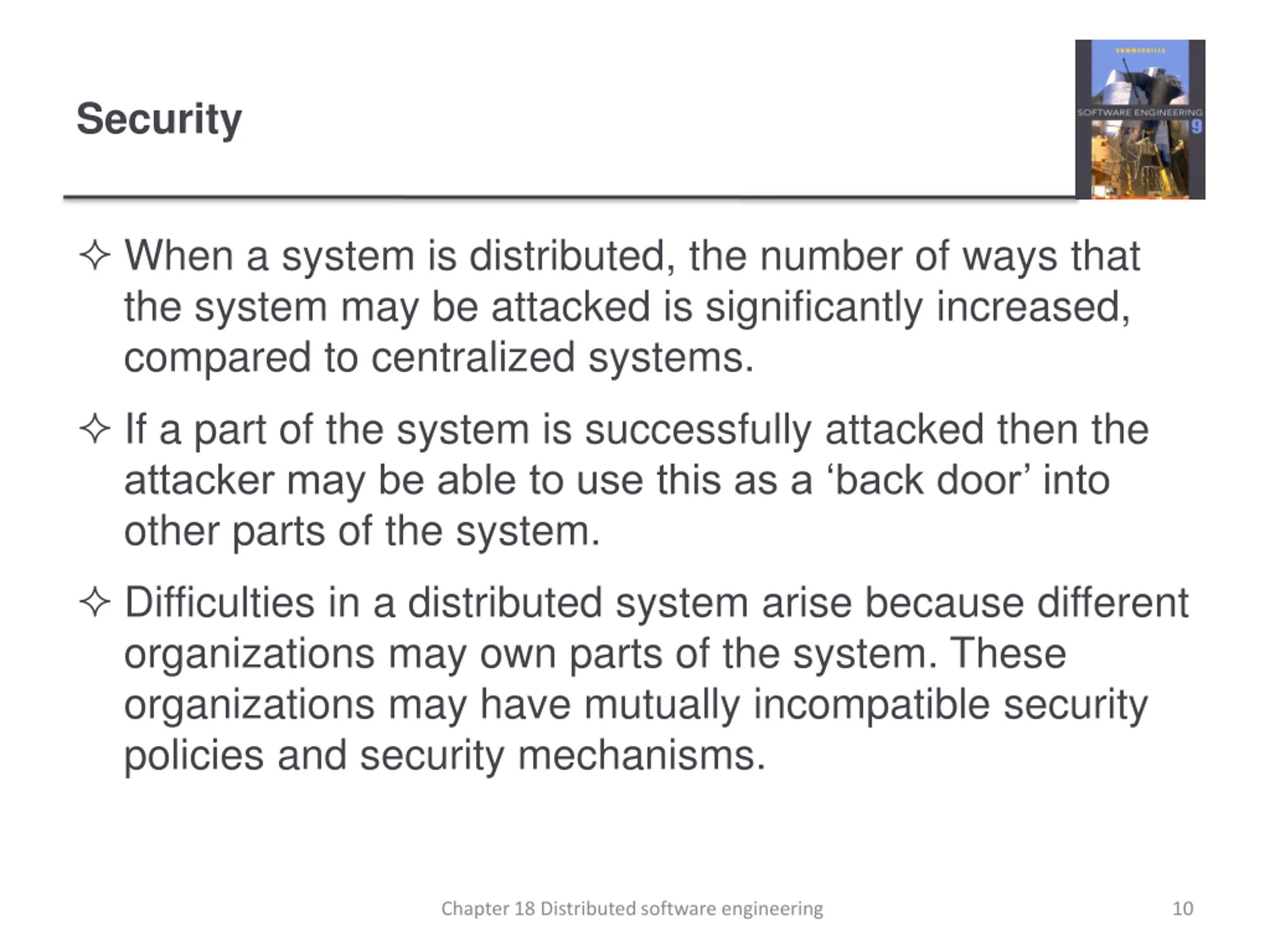 Security When a system is distributed, the number of ways that the system may be attacked is significantly increased, compared to centralized systems. If a part of the system is successfully attacked then the attacker may be able to use this as a back door into other parts of the system. Difficulties in a distributed system arise because different organizations may own parts of the system. These organizations may have mutually incompatible security policies and security mechanisms. Chapter 18 Distributed software engineering 10