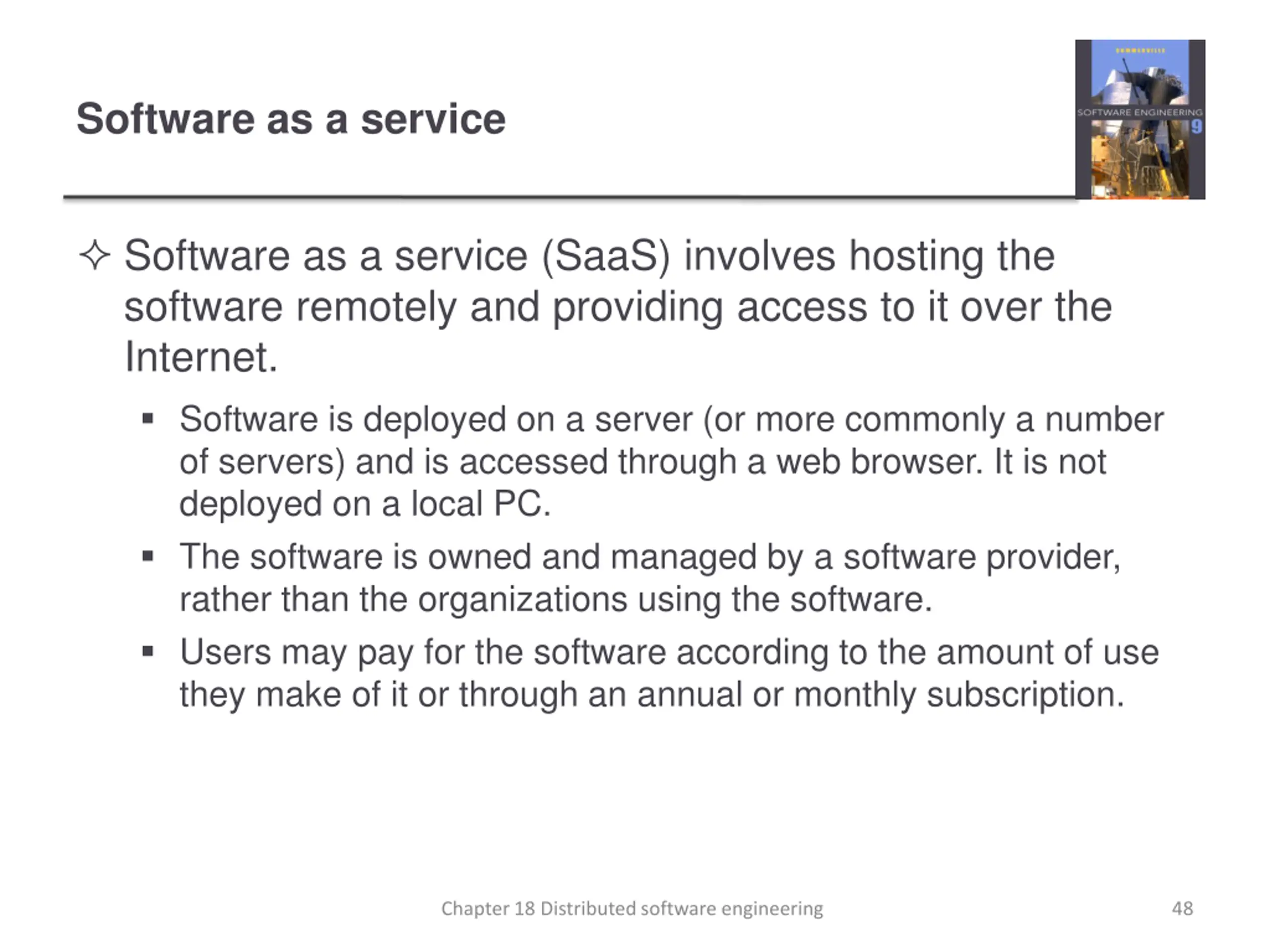 Software as a service Software as a service (SaaS) involves hosting the software remotely and providing access to it over the Internet. Software is deployed on a server (or more commonly a number of servers) and is accessed through a web browser. It is not deployed on a local PC. The software is owned and managed by a software provider, rather than the organizations using the software. Users may pay for the software according to the amount of use they make of it or through an annual or monthly subscription. Chapter 18 Distributed software engineering 48