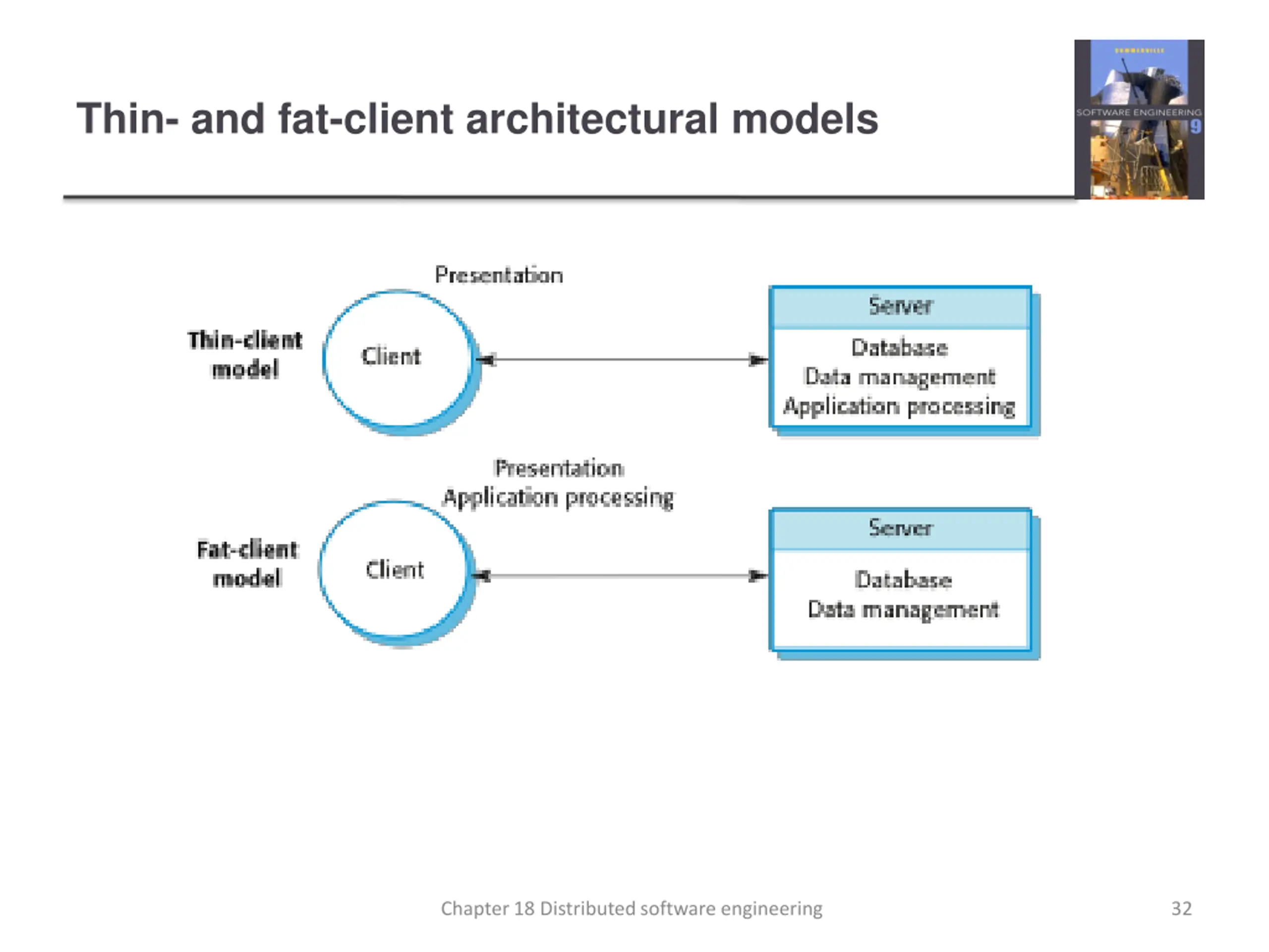 Two-tier client server architectures In a two-tier client-server architecture, the system is implemented as a single logical server plus an indefinite number of clients that use that server. Thin-client model, where the presentation layer is implemented on the client and all other layers (data management, application processing and database) are implemented on a server. Fat-client model, where some or all of the application processing is carried out on the client. Data management and database functions are implemented on the server. Chapter 18 Distributed software engineering 31