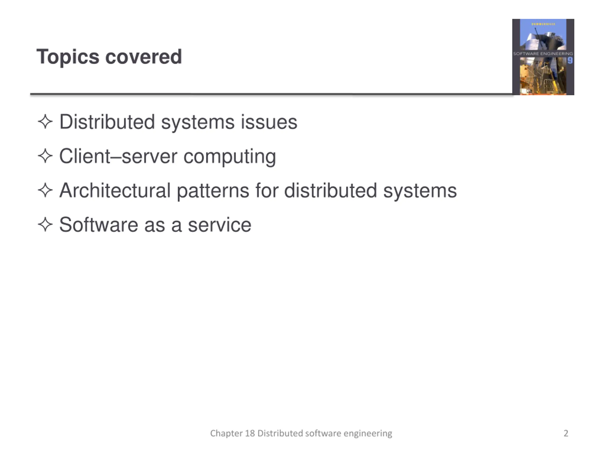 Topics covered Distributed systems issues Client server computing Architectural patterns for distributed systems Software as a service Chapter 18 Distributed software engineering 2